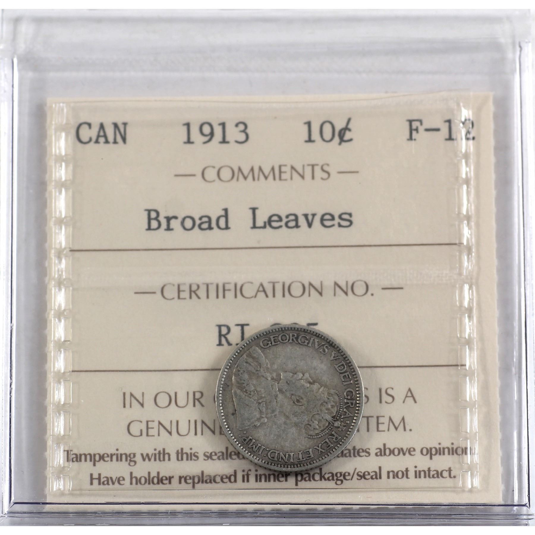 10-cent 1913 Broad Leaves ICCS Certified F-12.