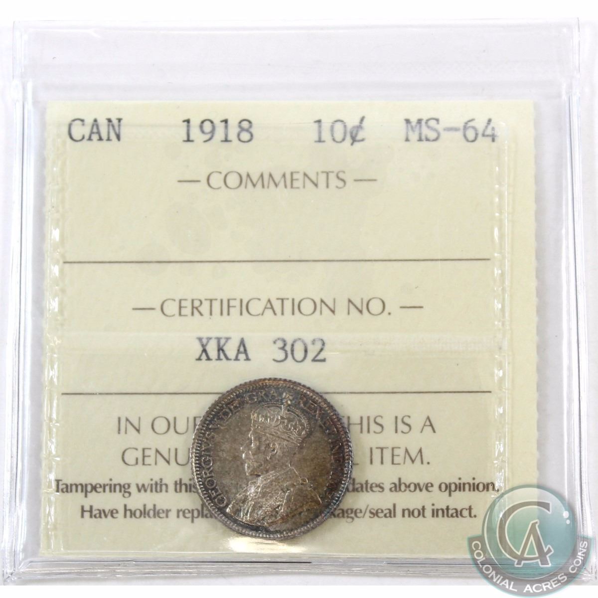 10-cent 1918 ICCS Certified MS-64. Nice deep toning with underlying mint luster shining through.