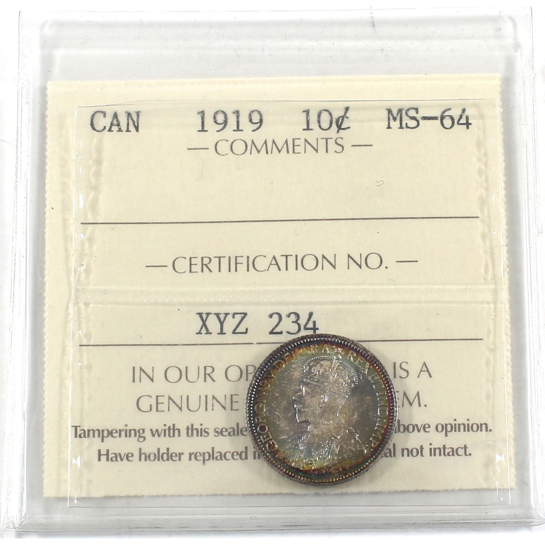 10-cent 1919 ICCS Certified MS-64. Amazing toning! Very stunning rainbow toning with underlying lustrous fields. A choice coin worth a premium bid!