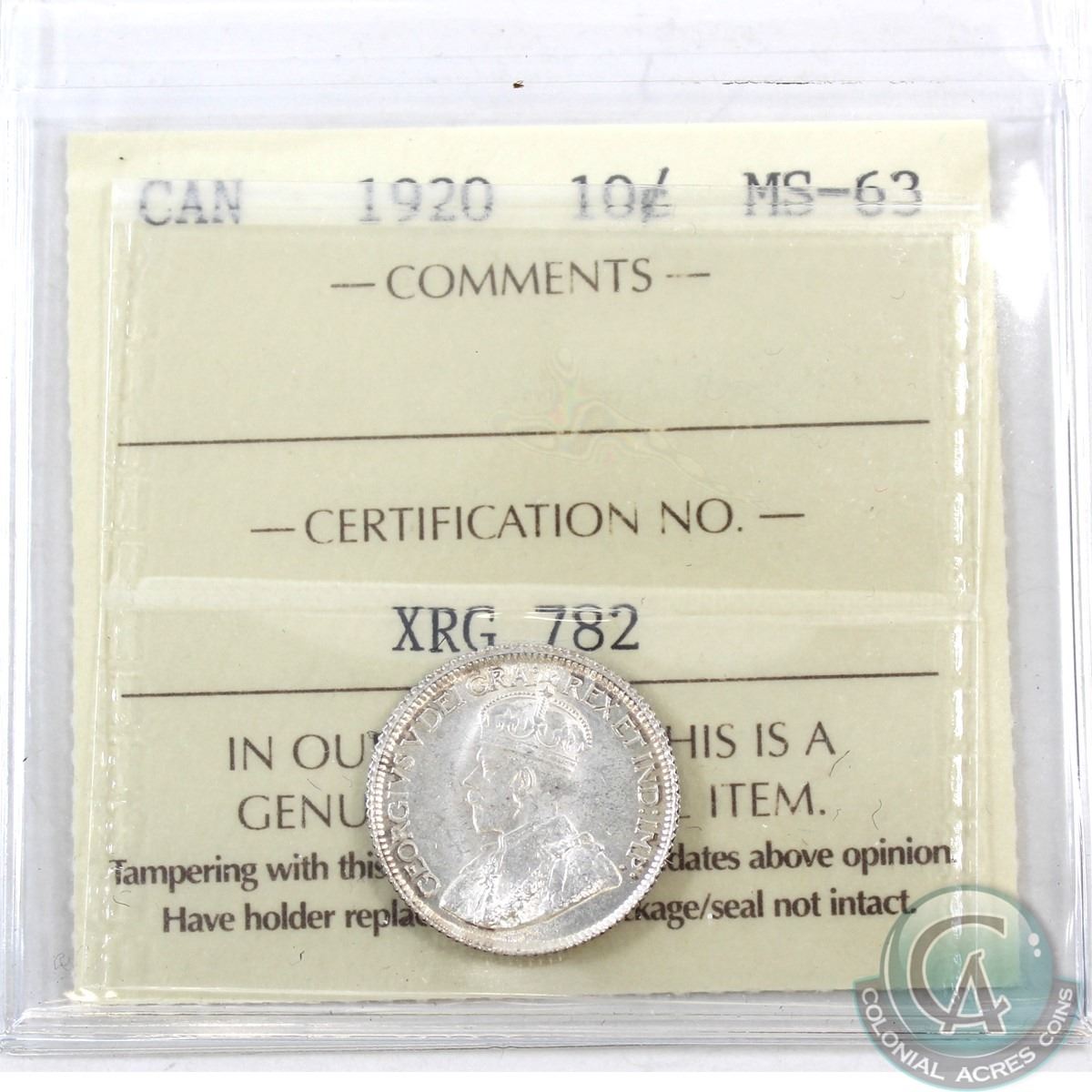 10-cent 1920 ICCS Certified MS-63
