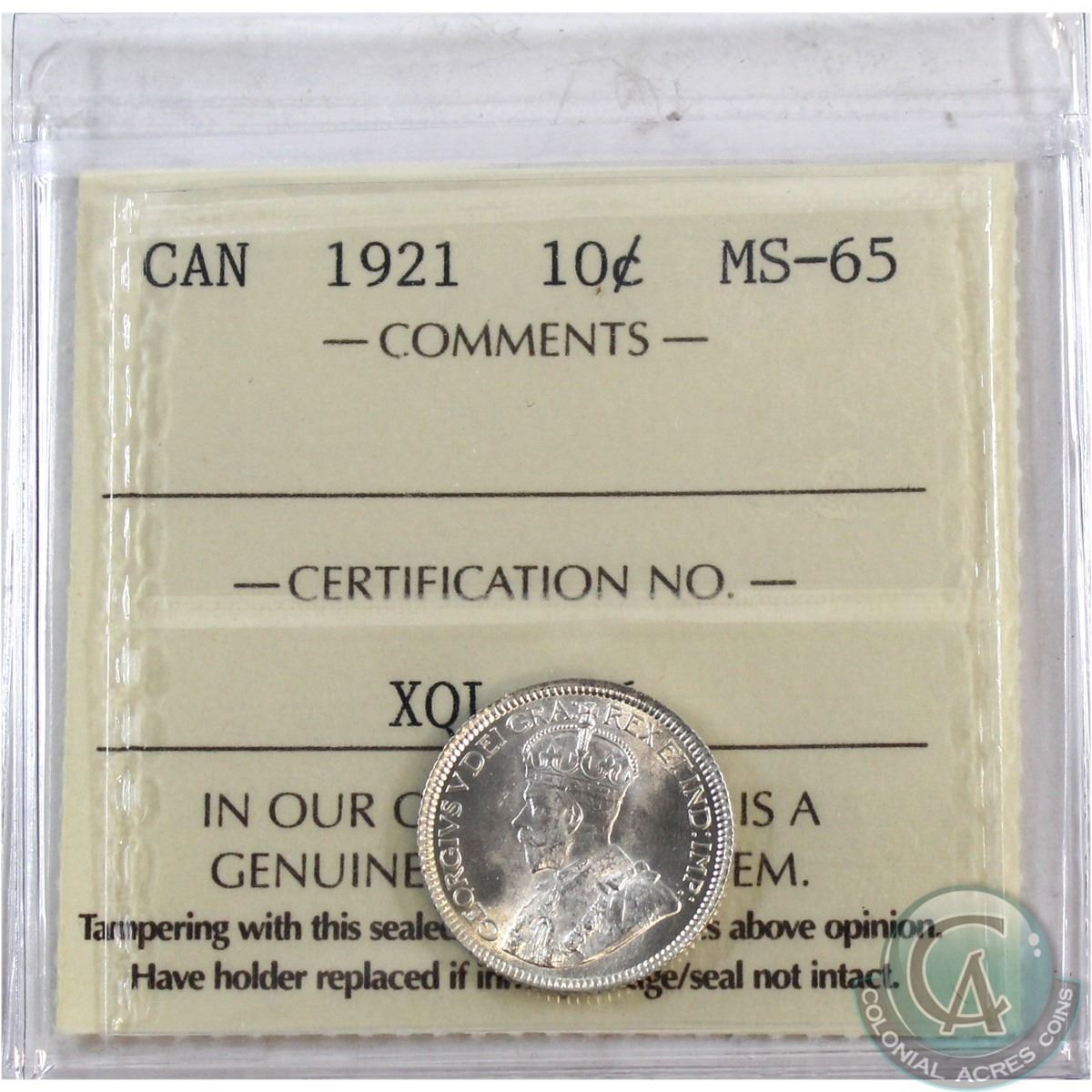 10-cent 1921 ICCS Certified MS-65. A choice coin with low numbers in MS-65 grades, any only 1 graded higher by ICCS.