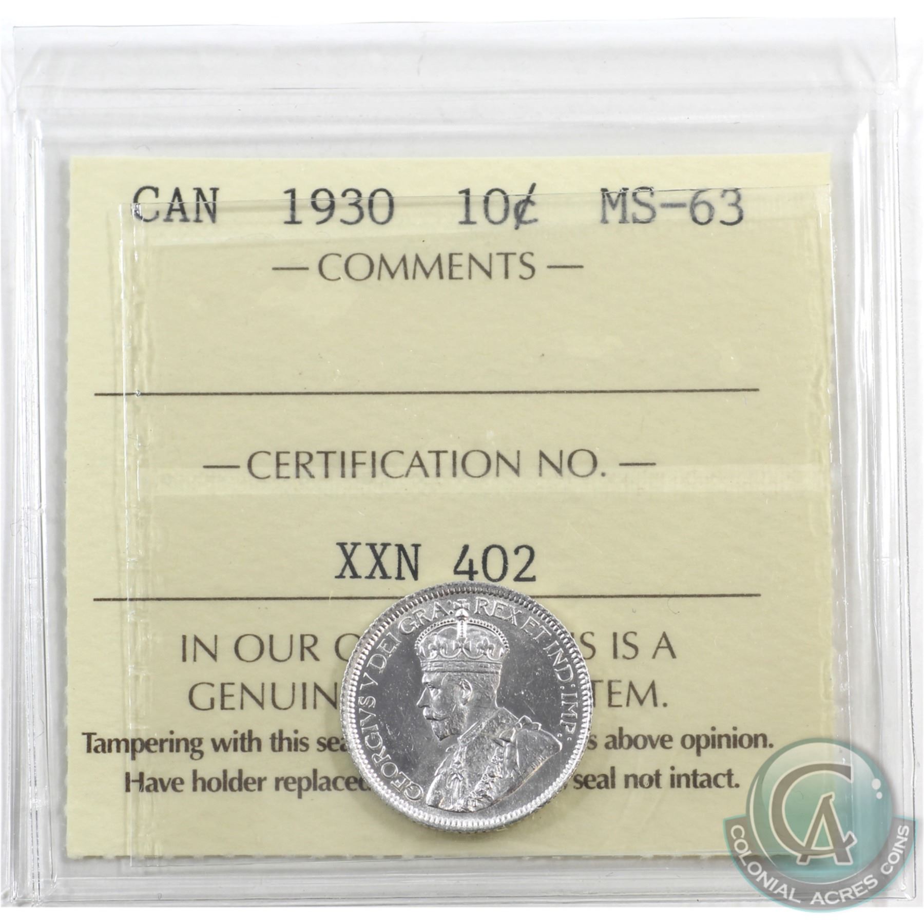 10-cent 1930 ICCS Certified MS-63. Blast white, immaculate strike
