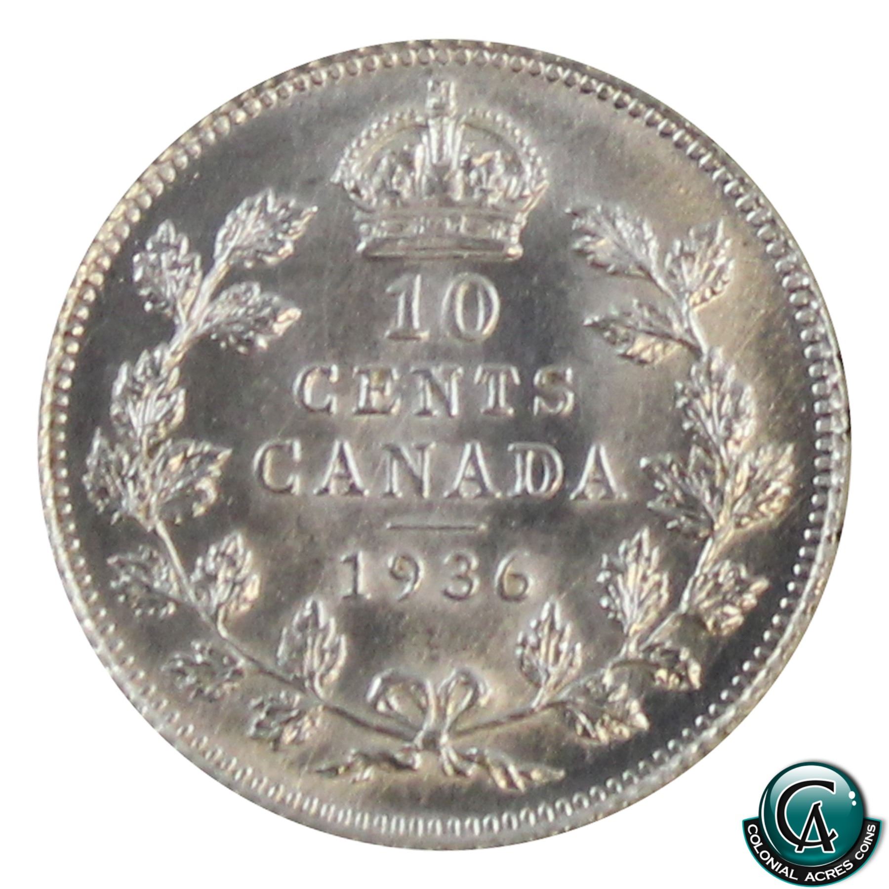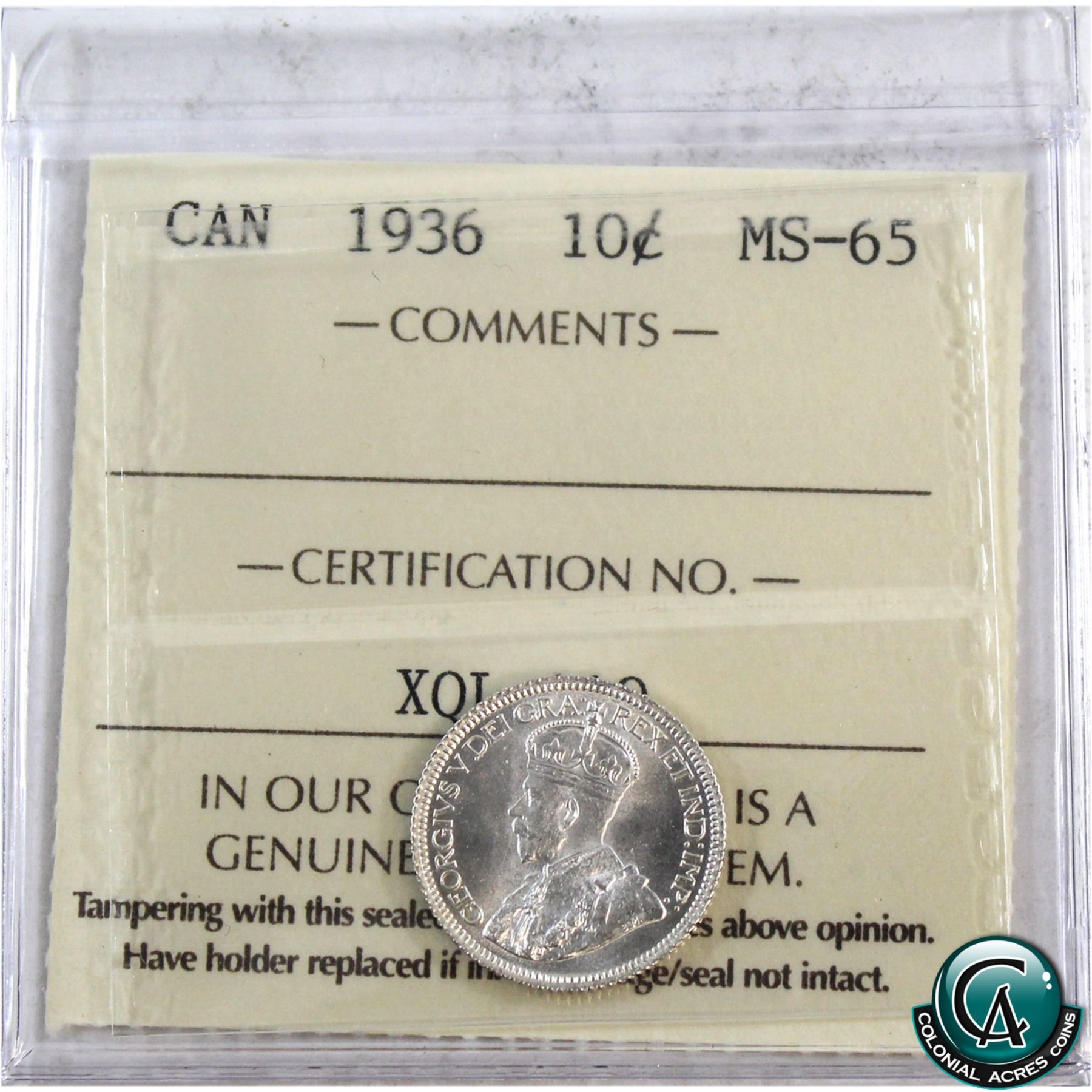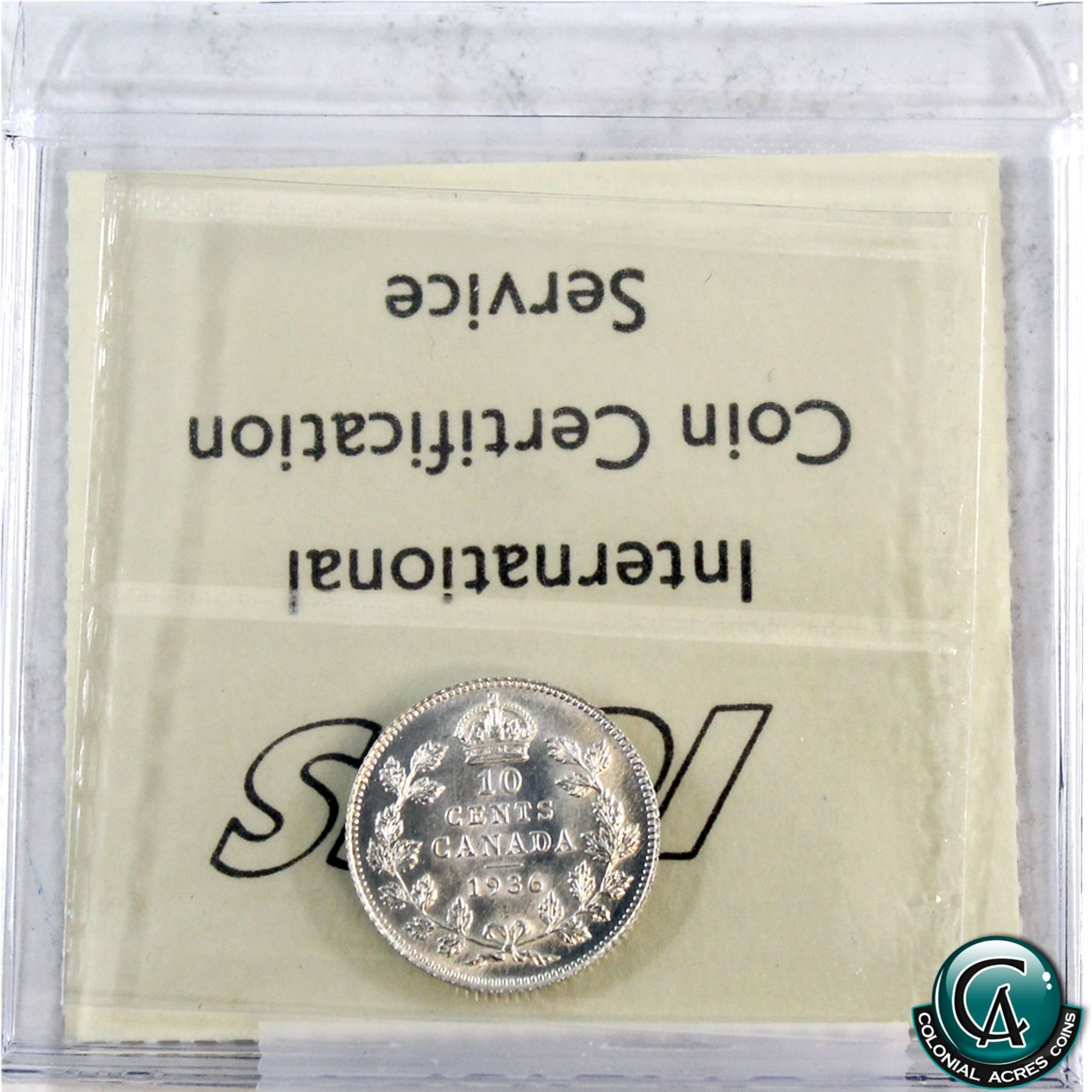 10-cent 1936 ICCS Certified MS-65. A nice last year issue George 6th coin!