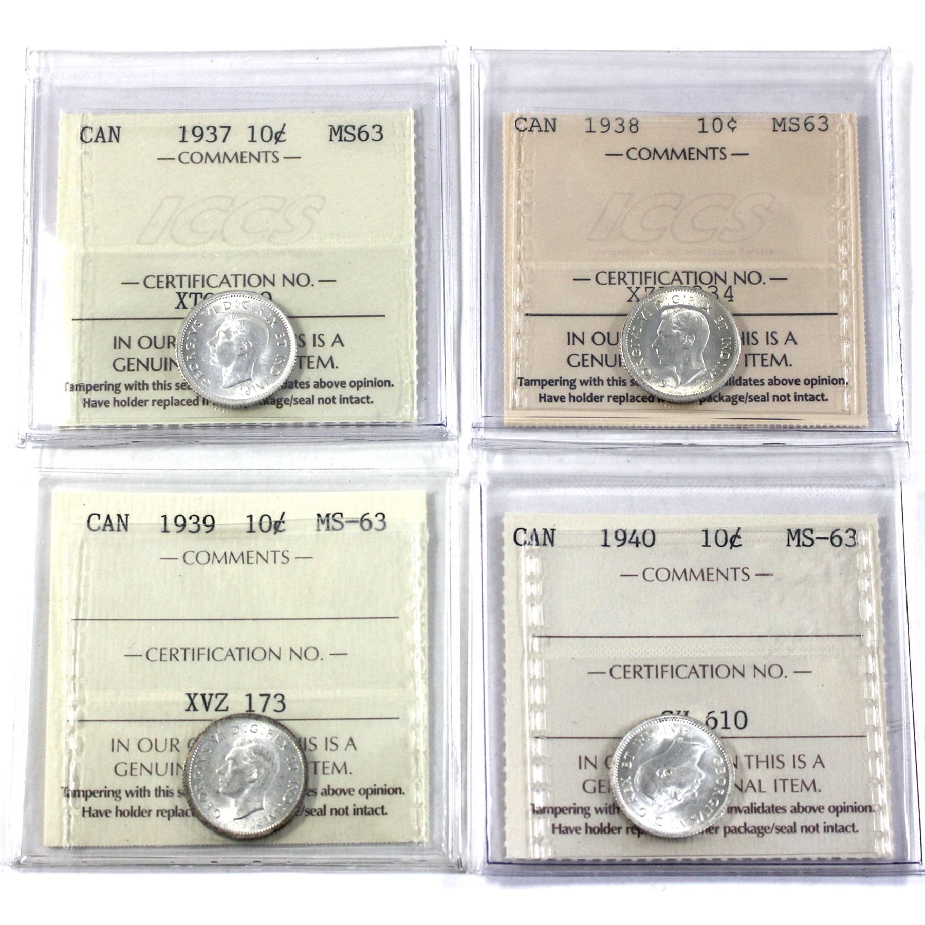10-cent 1937, 1938, 1939 & 1940 ICCS MS63. 4pcs