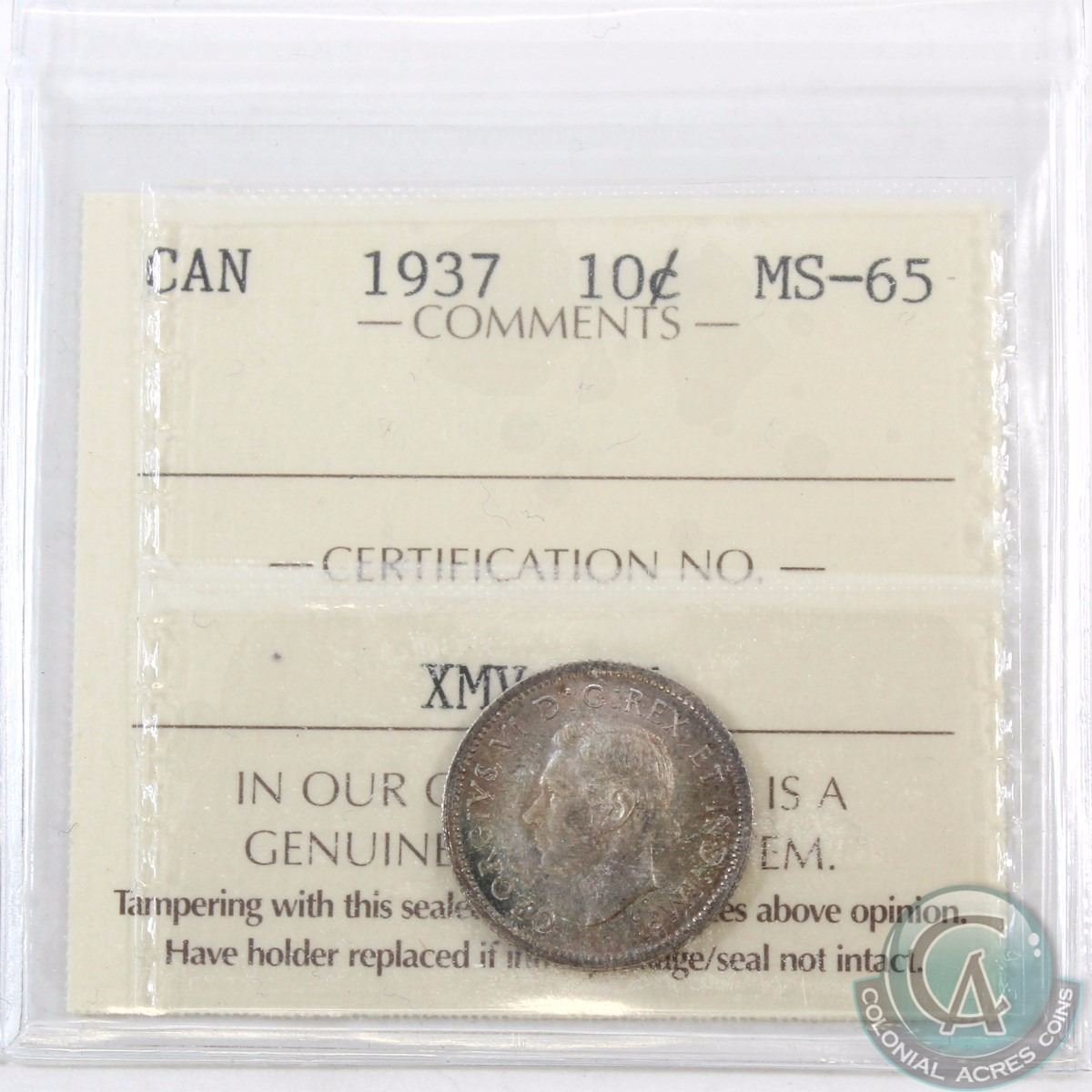 10-cent 1937 ICCS Certified MS-65. A nice original toned coin with olive green and blue toning throughout the coin.