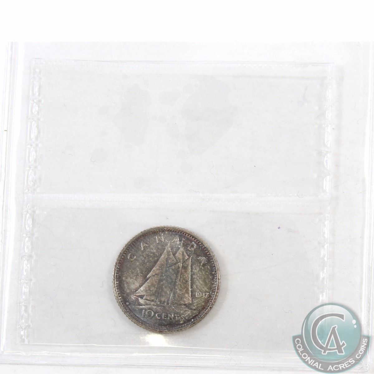 10-cent 1937 ICCS Certified MS-65. A nice original toned coin with olive green and blue toning throu