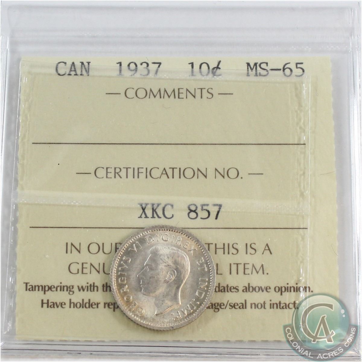 10-cent 1937 ICCS Certified MS-65