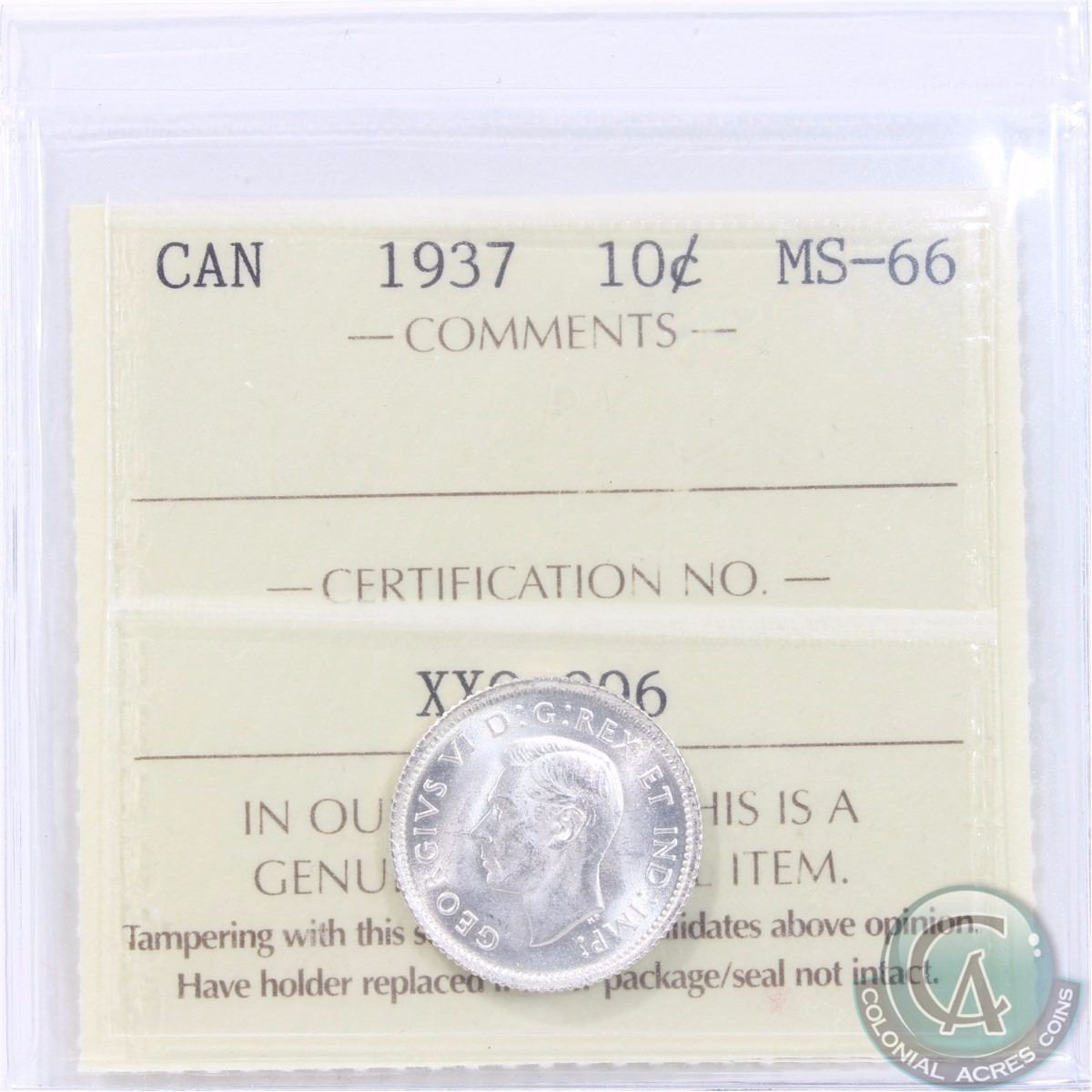 10-cent 1937 ICCS Certified MS-66! Tied for the Highest Grade by ICCS (1 of 6). A nice blast white coin.