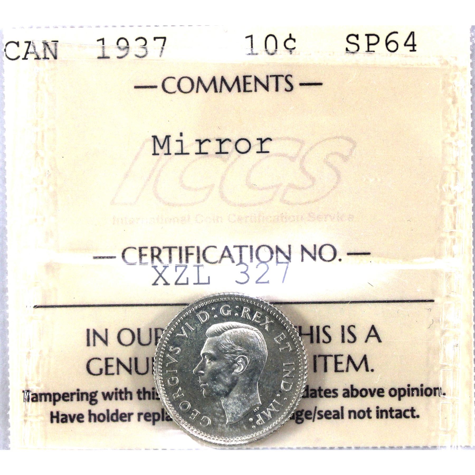 10-cent 1937 Mirror ICCS Certified SP64. *Scarcer Variety!* Stunning Mirror Finish & Even Natural Tones!