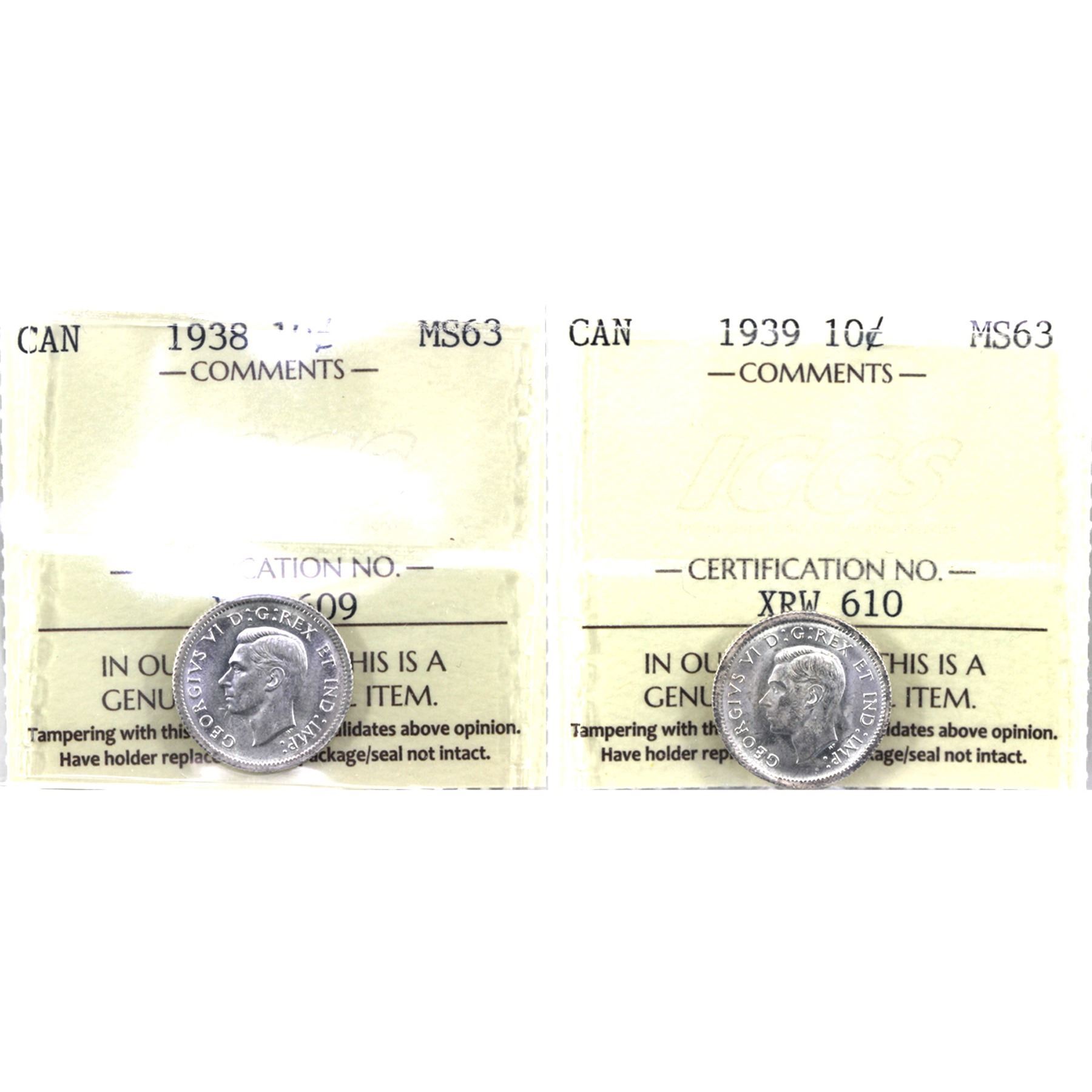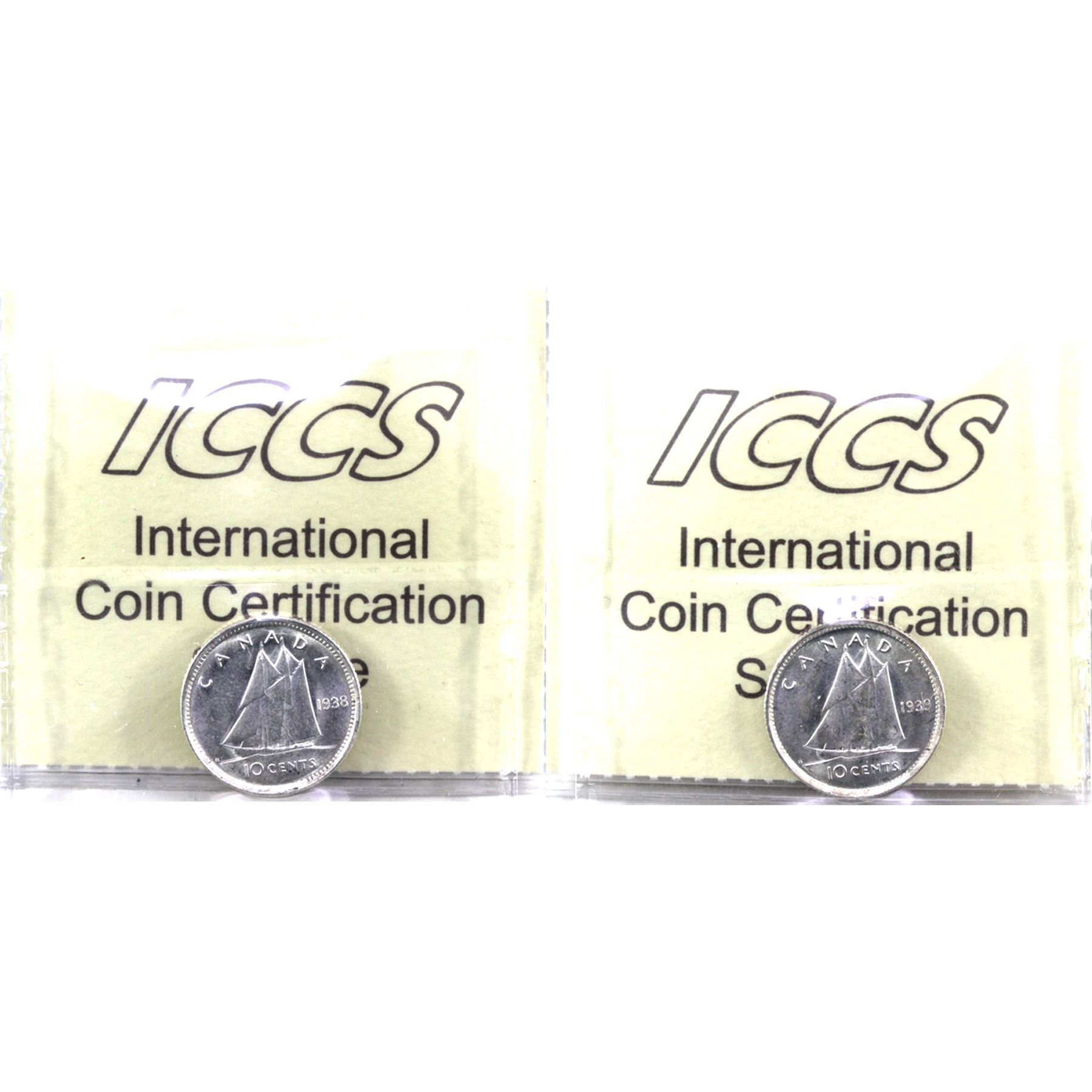 10-cent 1938 & 1939 ICCS Certified MS-63. 2pcs