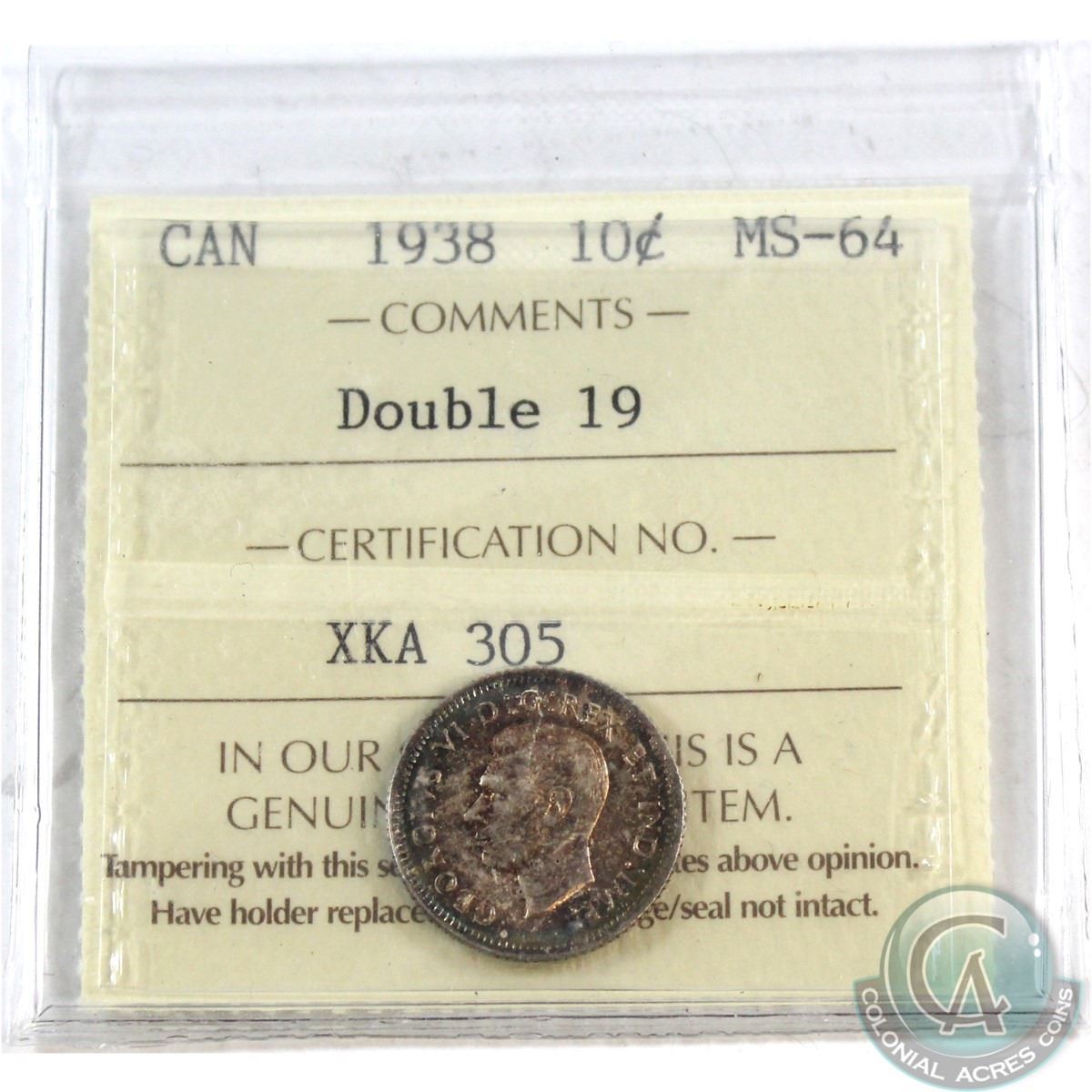 10-cent 1938 'Double 19' ICCS Certified MS-64