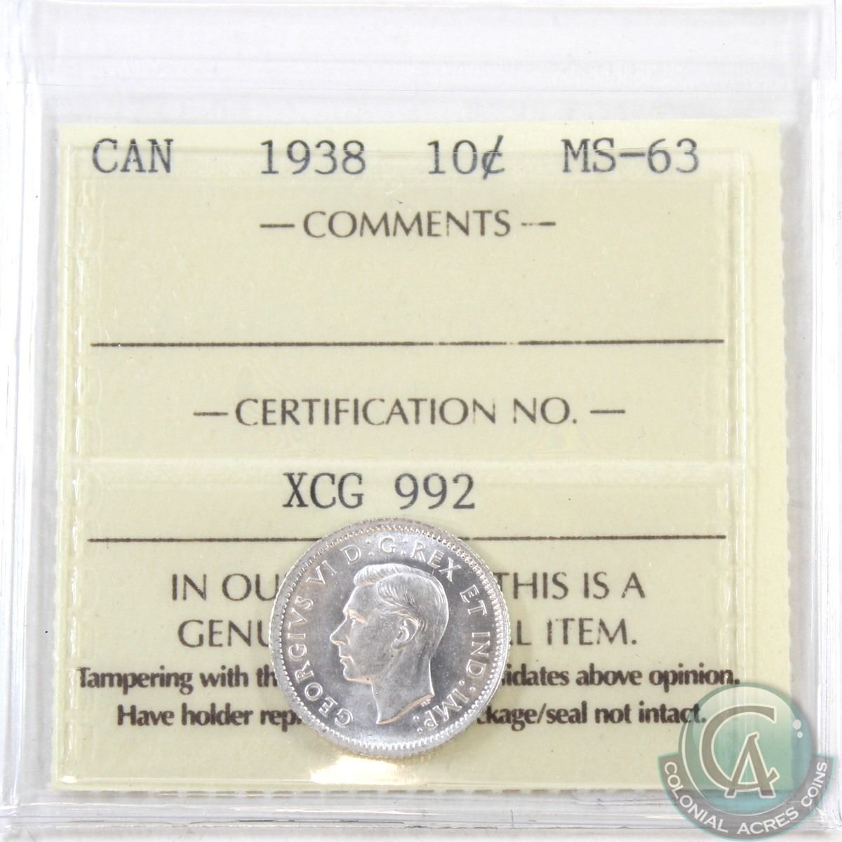 10-cent 1938 ICCS Certified MS-63