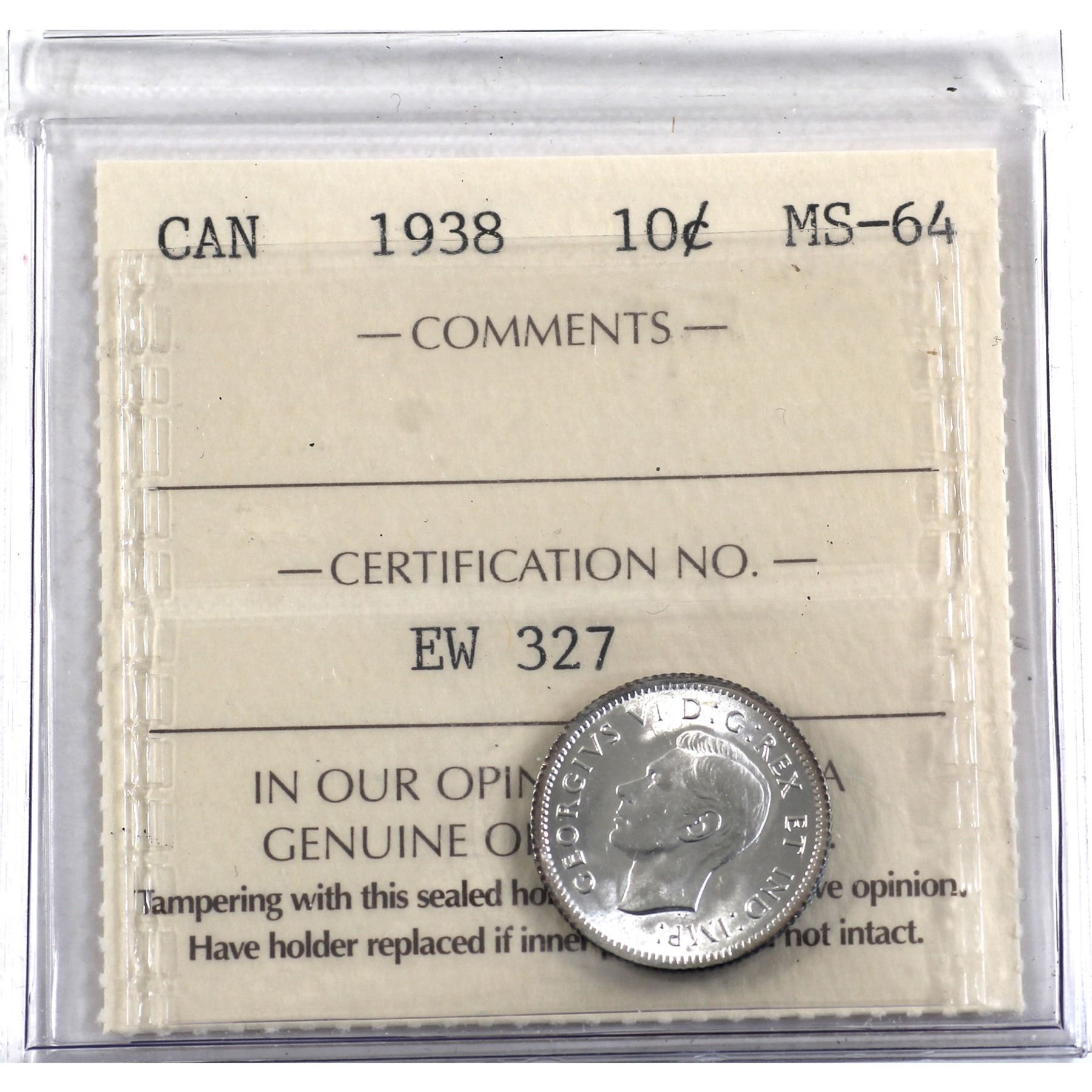 10-cent 1938 ICCS Certified MS-64. A full mint luster coin with soft satin fields.