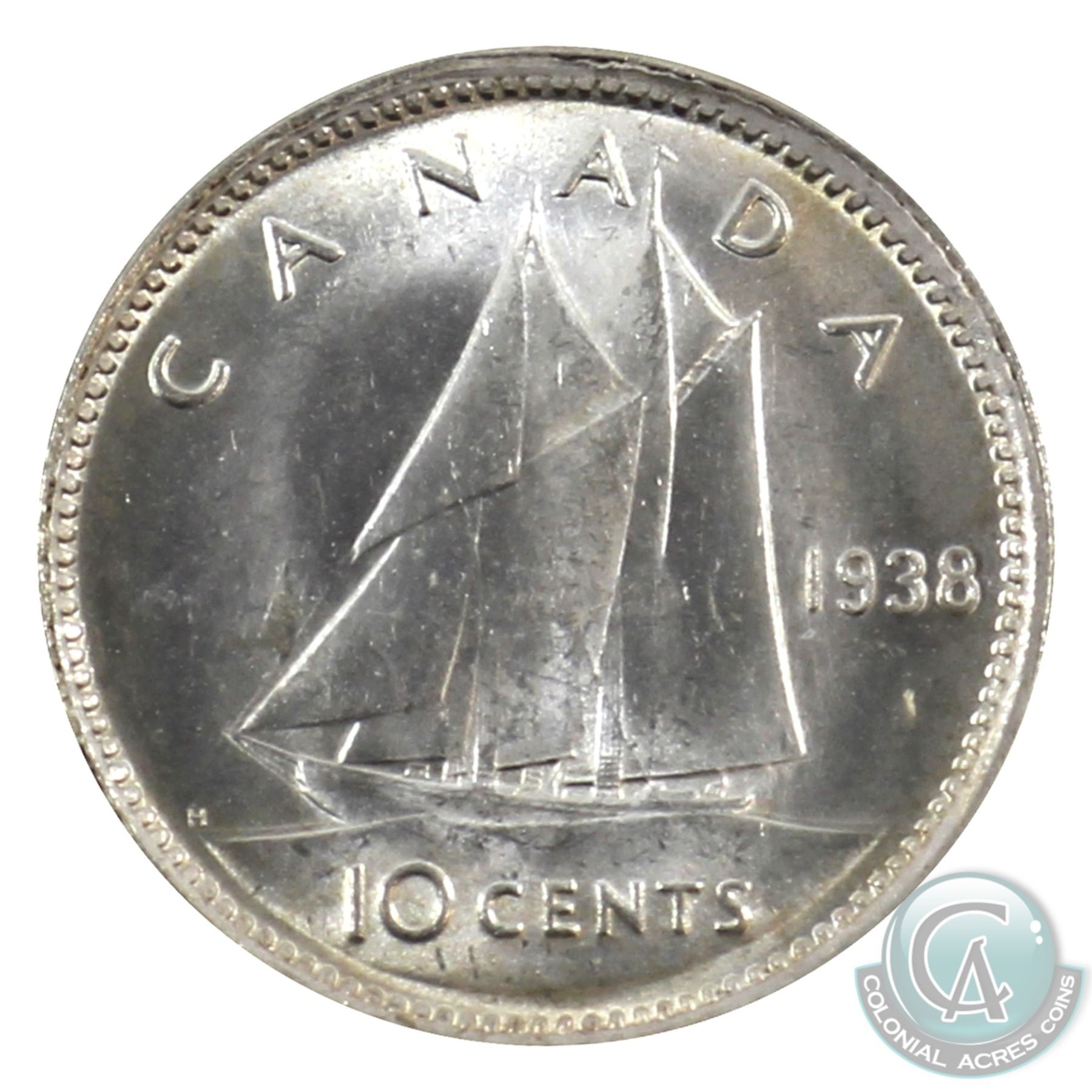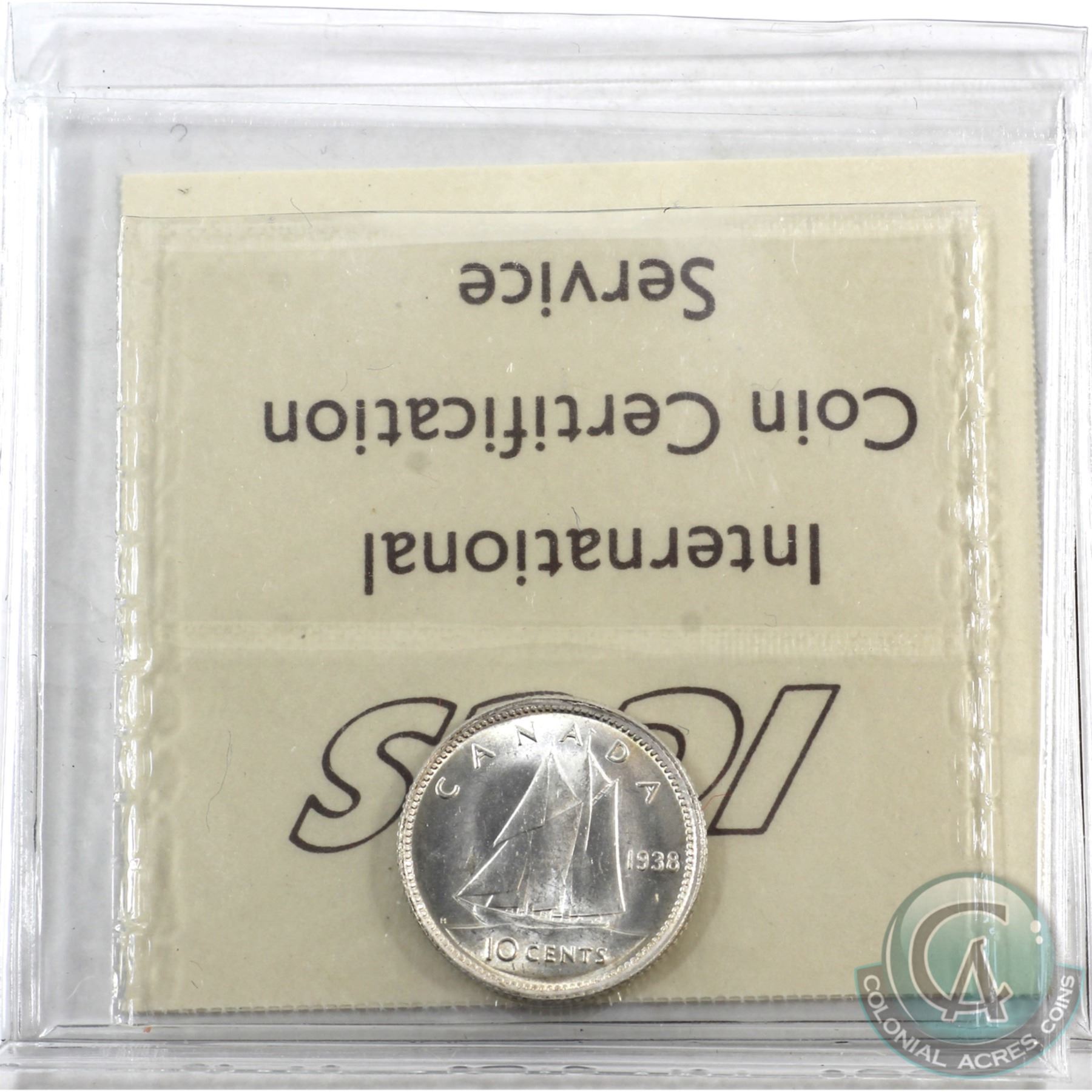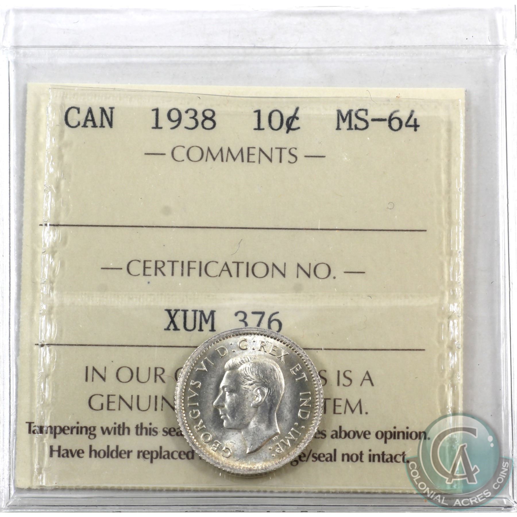 10-cent 1938 ICCS Certified MS-64. Soft satin finish accented with light golden tones throughout.