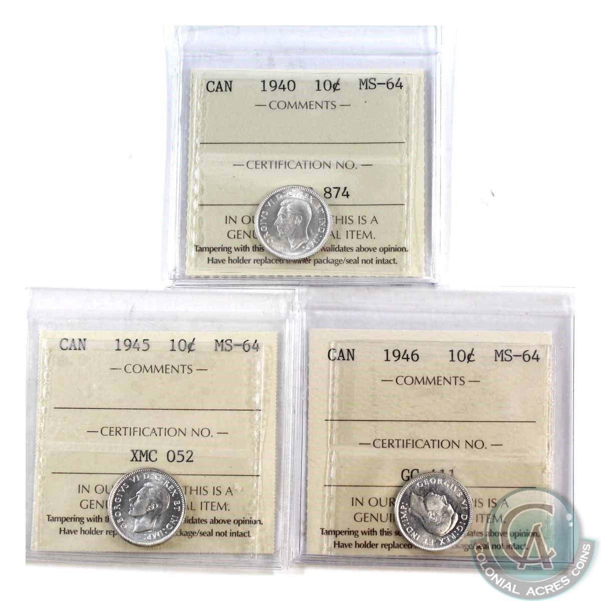 10-cent 1940, 1945, & 1946 ICCS Certified MS-64. 3pcs