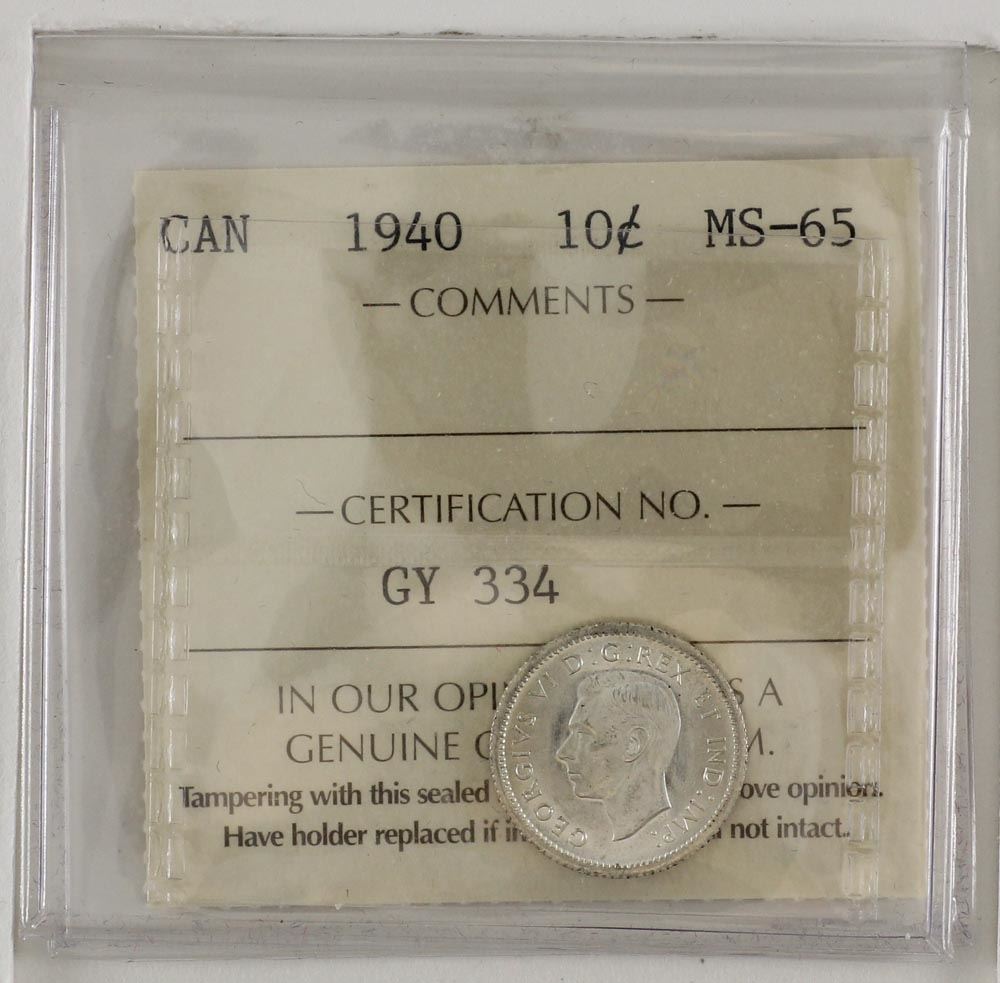 10-cent 1940 ICCS MS65. Blast white with a hint of cameo on the portrait