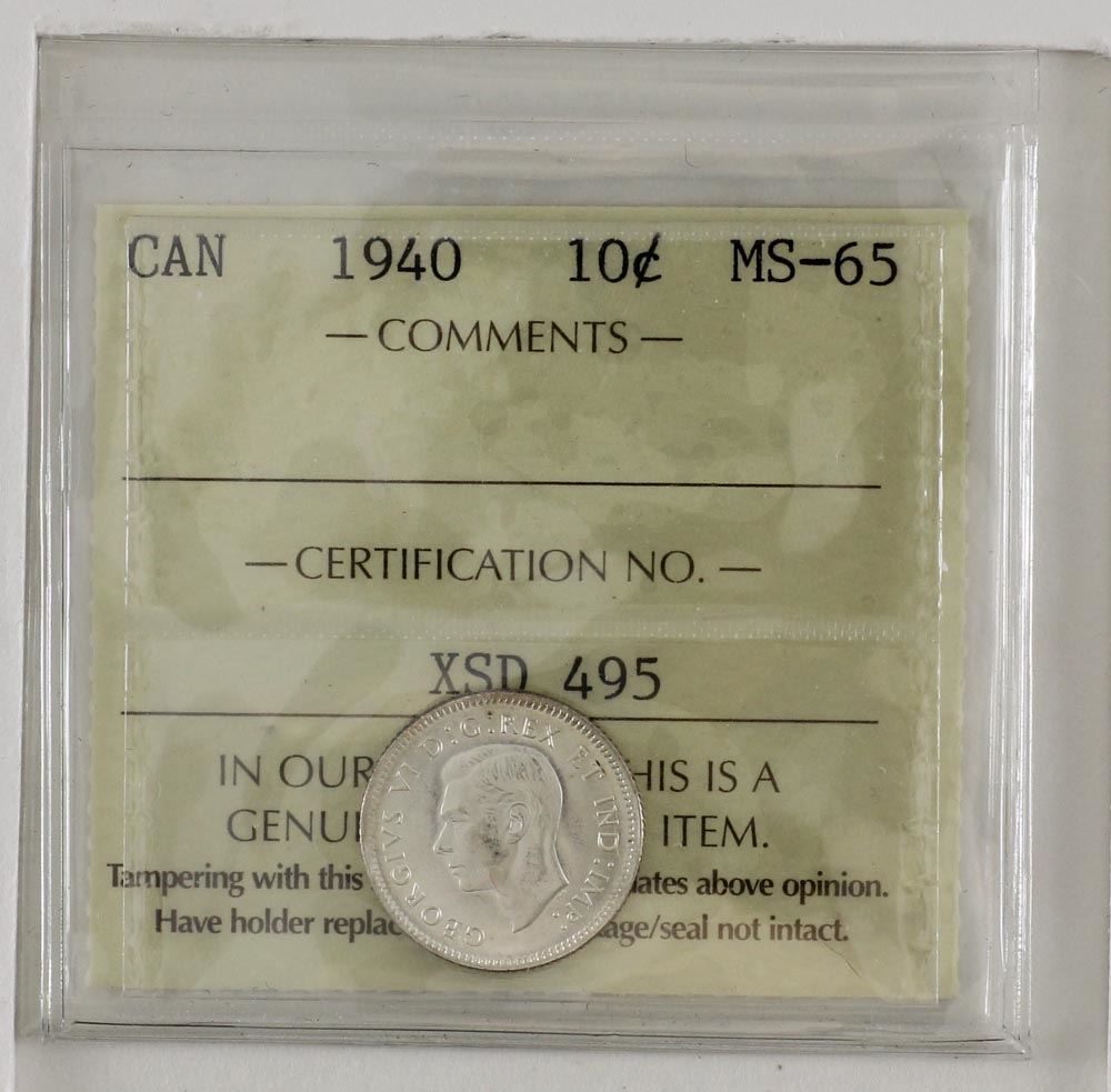 10-cent 1940 ICCS MS65. Blast white with light cameo on portrait.