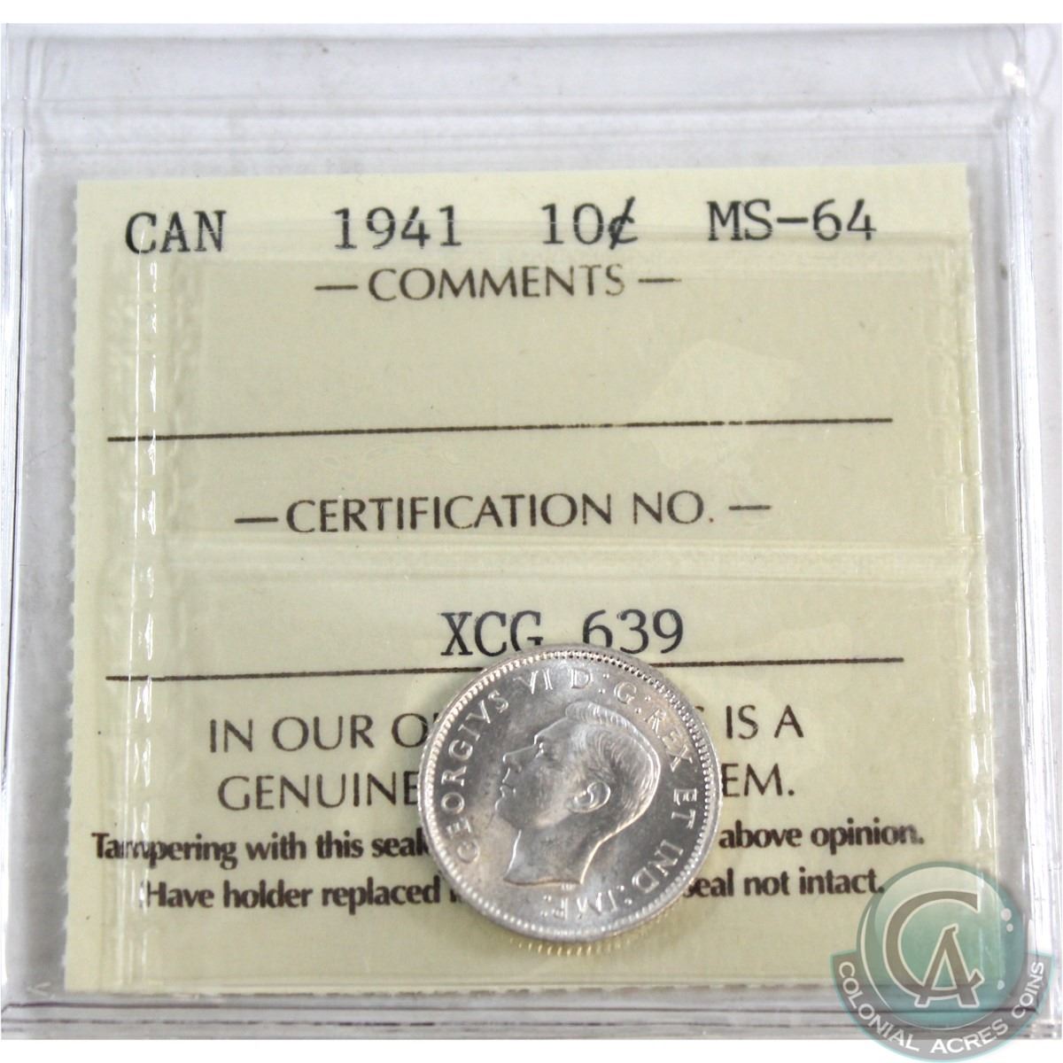 10-cent 1941 ICCS Certified MS-64. *Blast White*