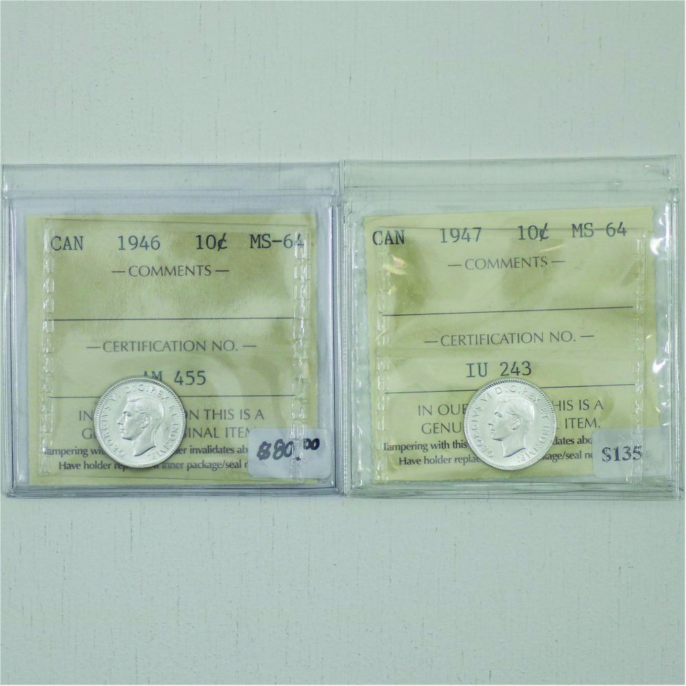 10-cent 1946 & 1947 ICCS Certified MS64. Lot of 2 coins.