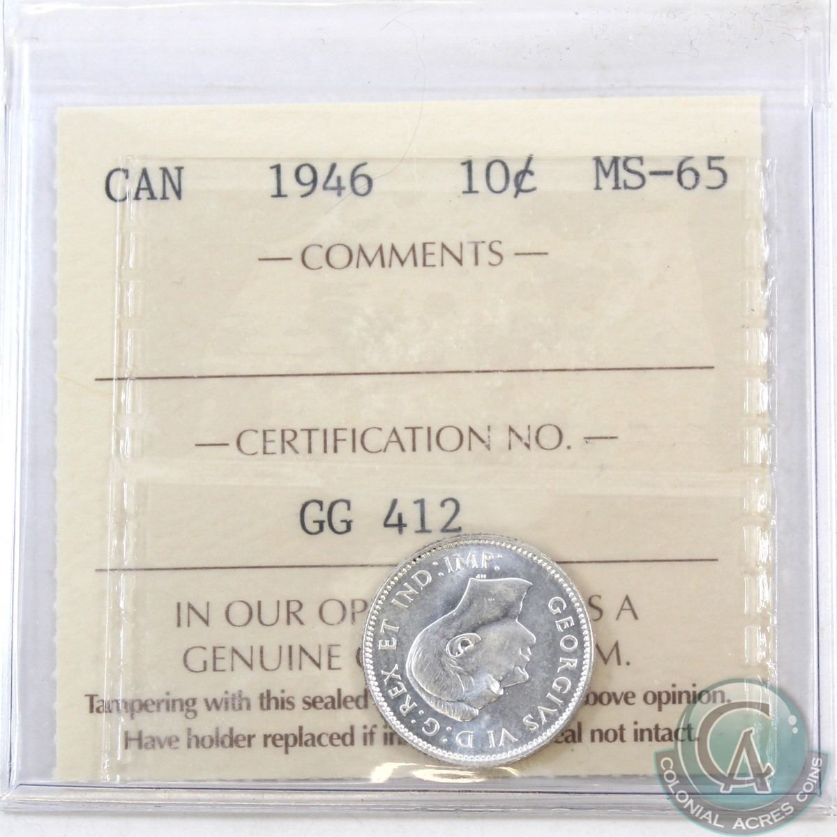 10-cent 1946 ICCS Certified MS-65. Bright coin with nice rolling luster.