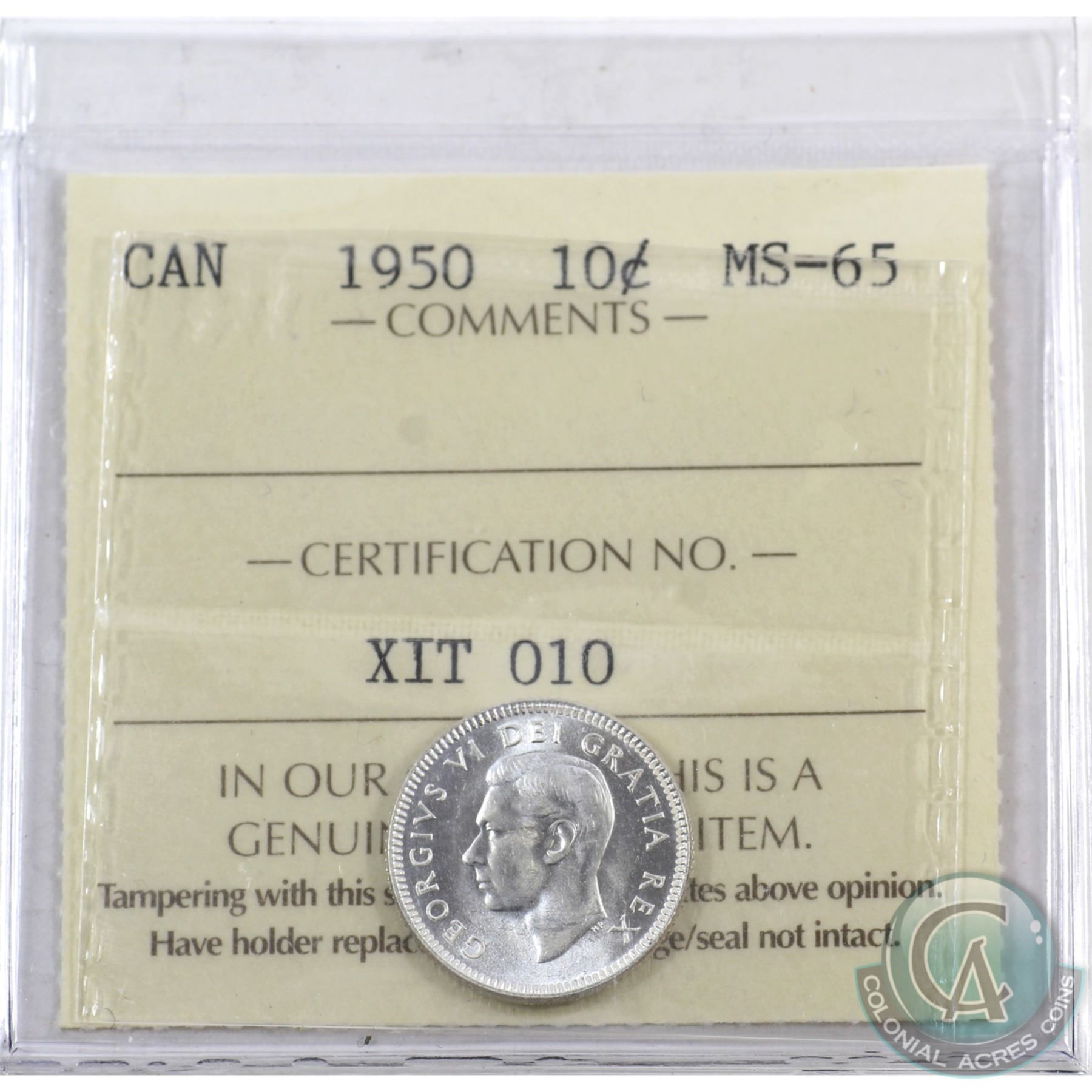 10-cent 1950 ICCS Certified MS-65.