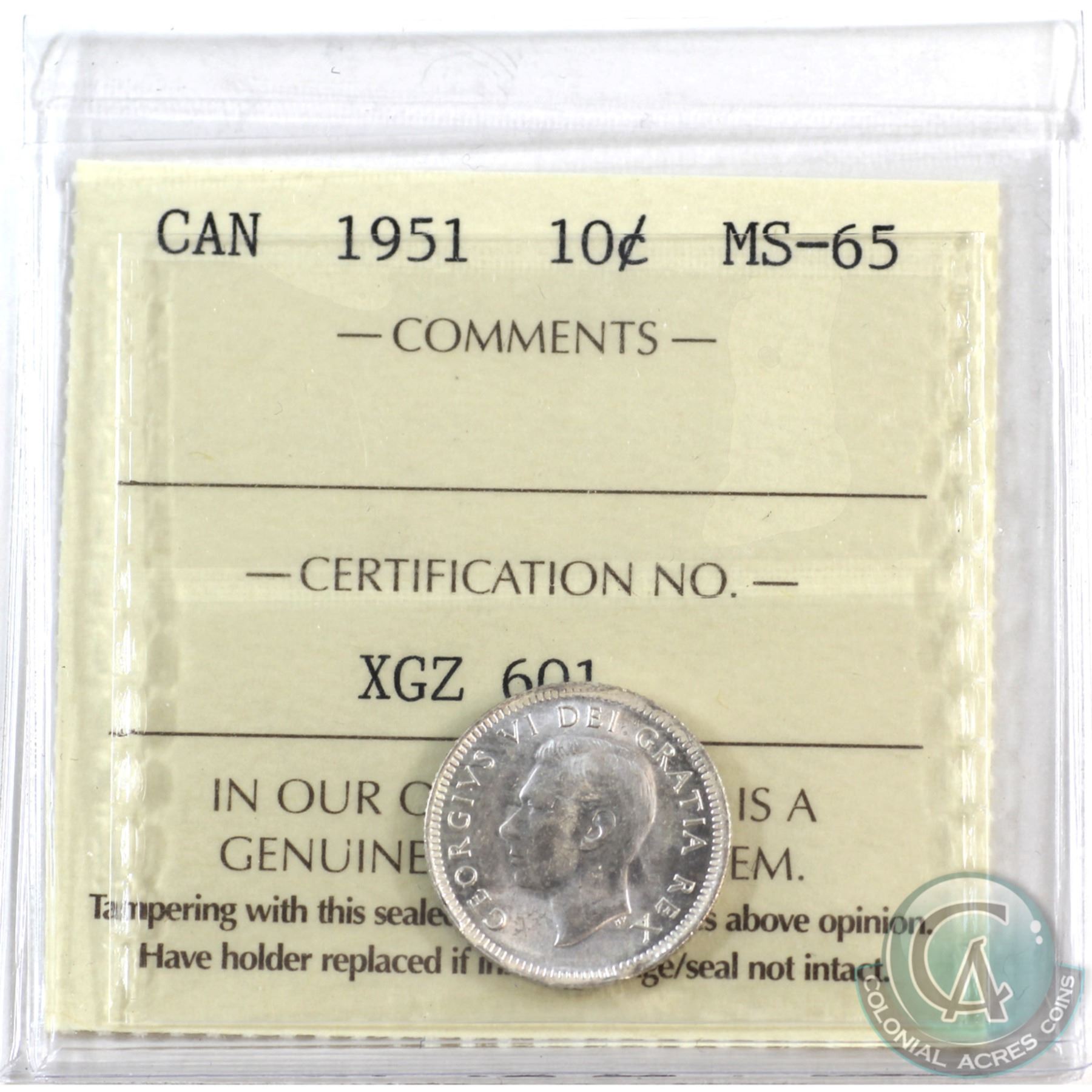 10-cent 1951 ICCS Certified MS-65.