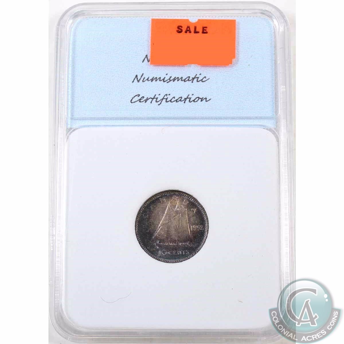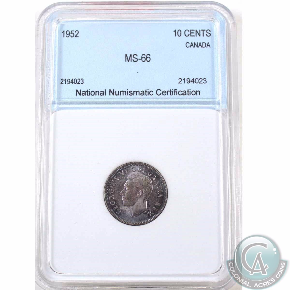 10-cent 1952 National Numismatic Certification MS-66.We recommend that you view the lot to form your own opinion of the grade. Sold as is, no returns