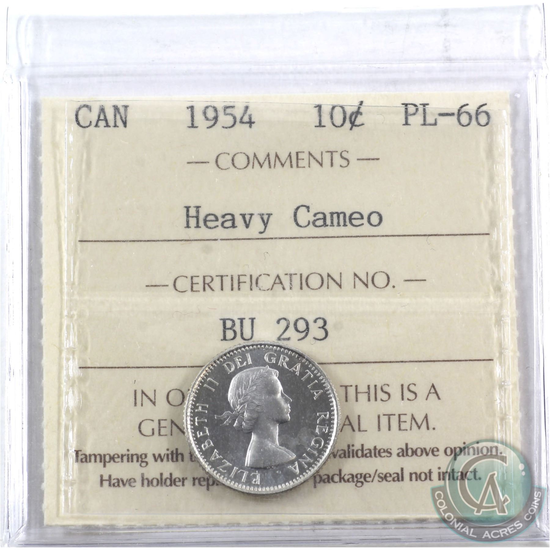 10-cent 1954 ICCS Certified PL-66 Heavy Cameo