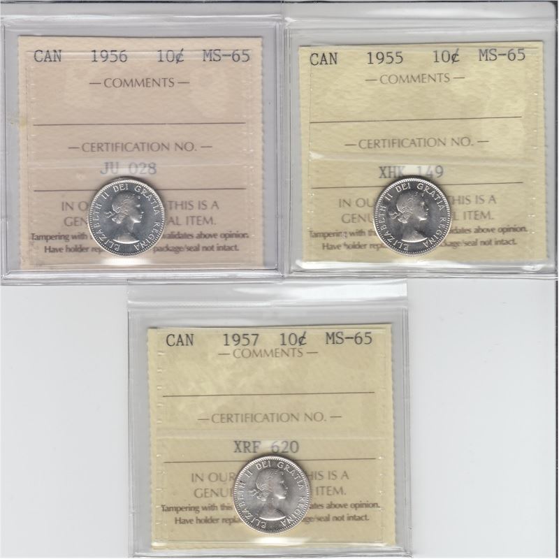 10-cent 1955, 1956 & 1957 ICCS MS65. Lot of 3 coins.