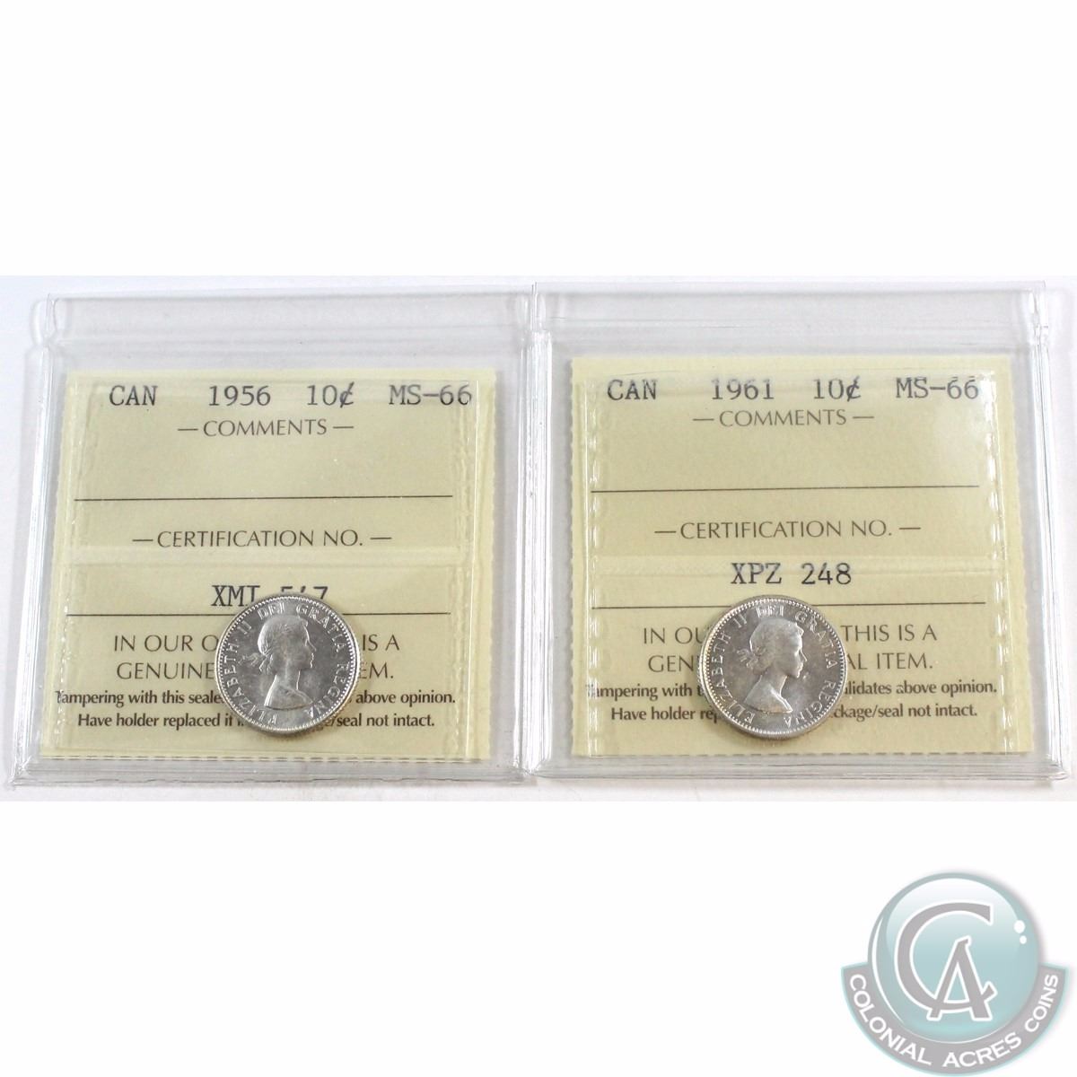 10-cent 1956, 1961 10-cent ICCS Certified MS-66. 2pcs.