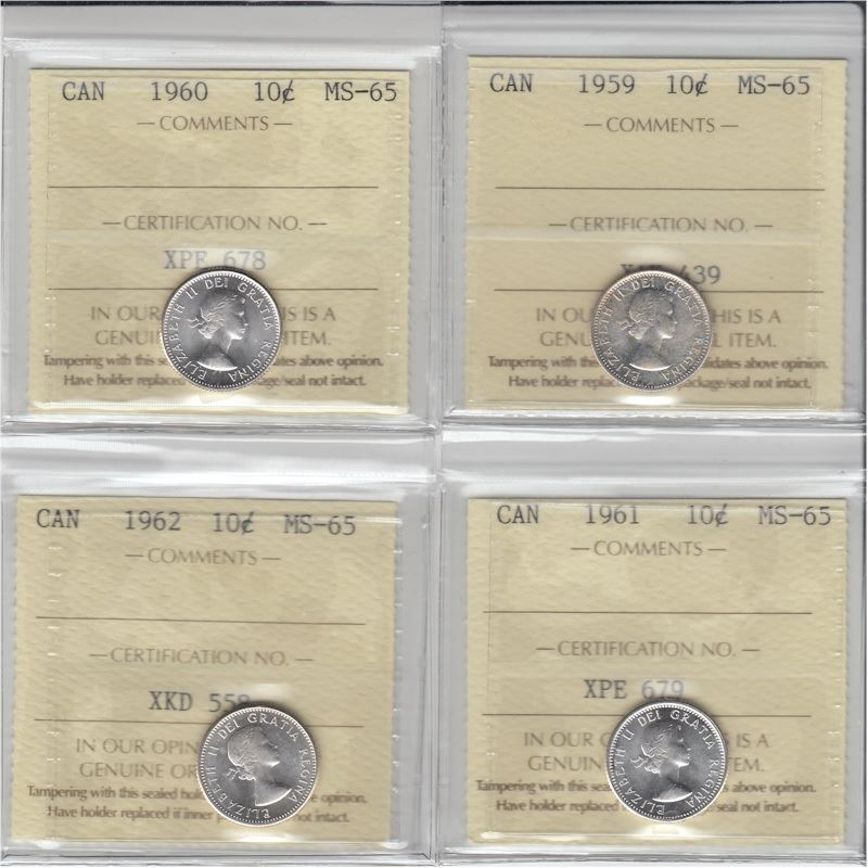 10-cent 1959, 1960, 1961 & 1962 ICCS MS65. Lot of 4 coins.