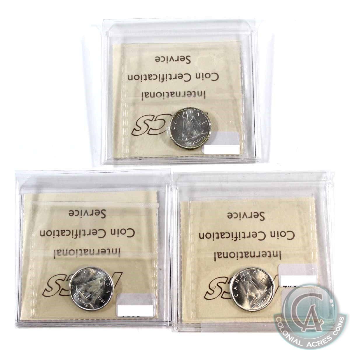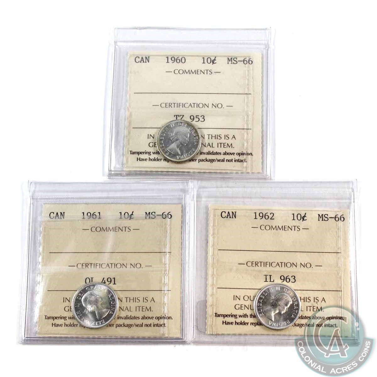 10-cent 1960, 1961 & 1962 ICCS Certified MS-66. 3pcs