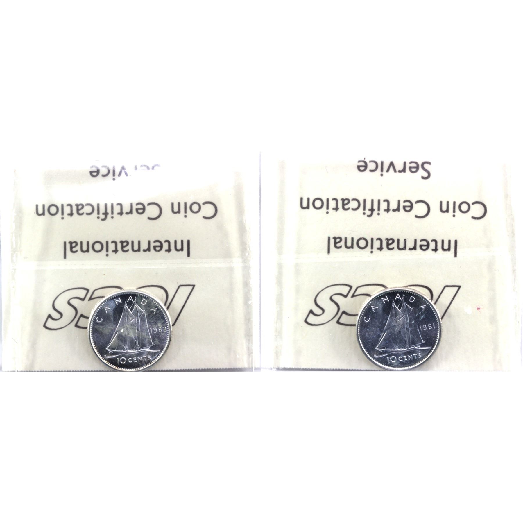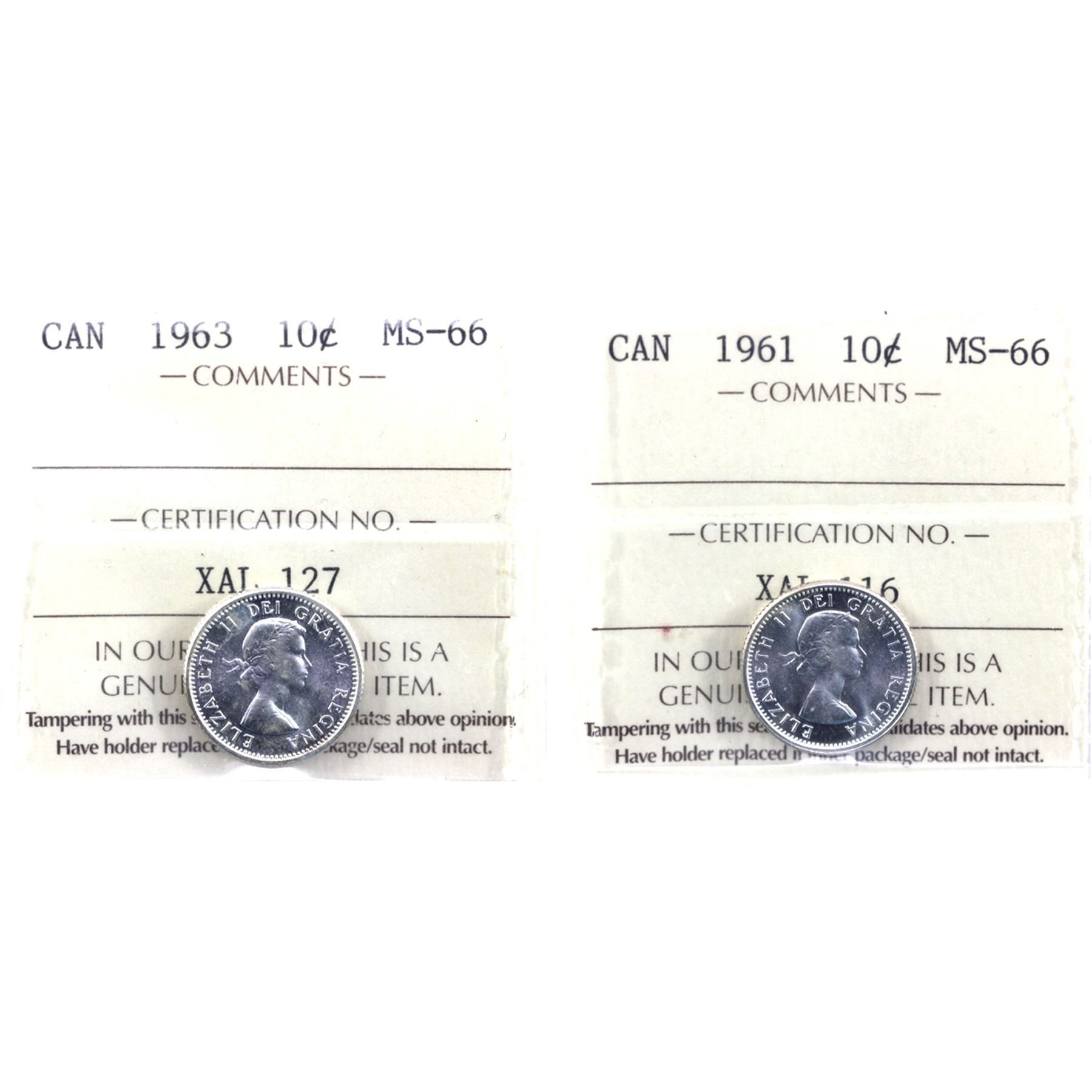 10-cent 1961 & 1963 ICCS Certified MS-66. 2pcs
