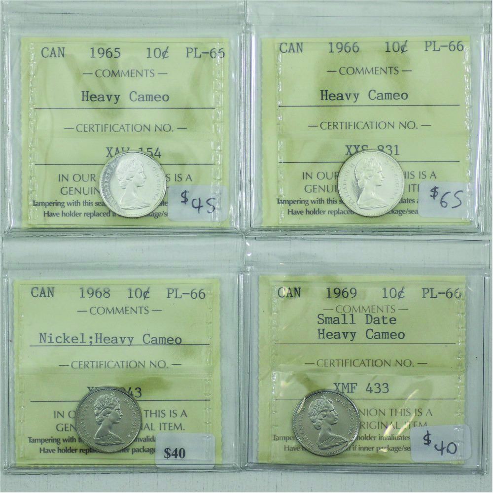 10-cent 1965, 1966, 1968 & 1969 ICCS PL66 Heavy Cameo. Lot of 4 coins.