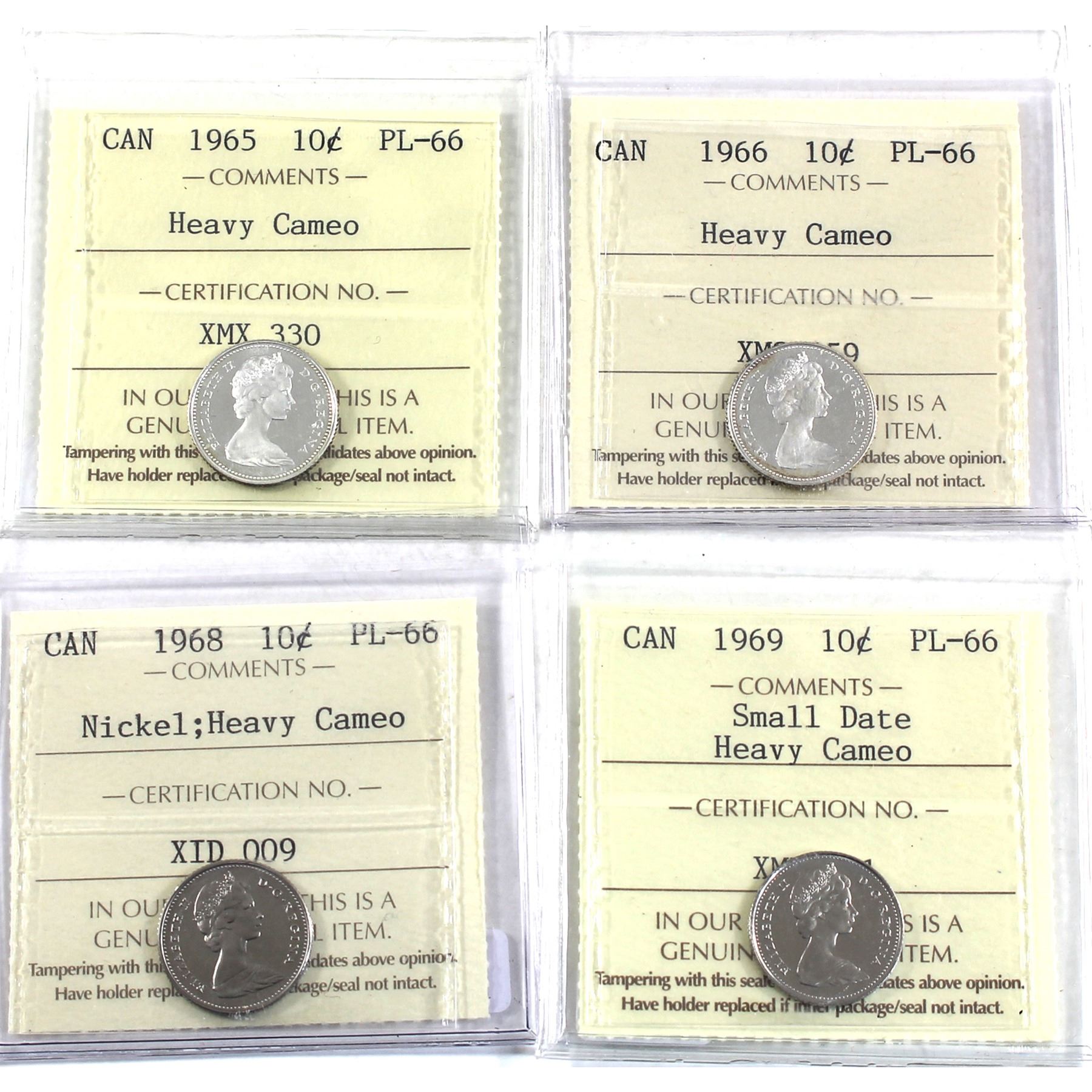 10-cent 1965, 1966, 1968 Nickel, and 1969 Small Date ICCS Certified PL-66 Heavy Cameo. 4pcs.