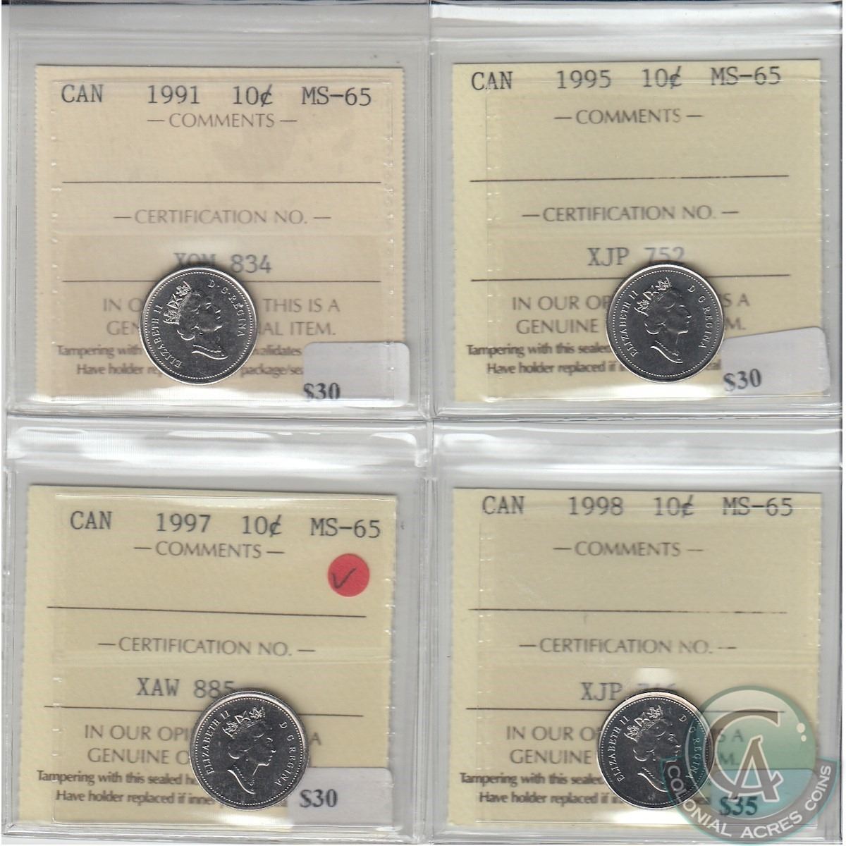 10-cent 1991, 1995, 1997 & 1998 ICCS Certified MS-65. 4pcs.