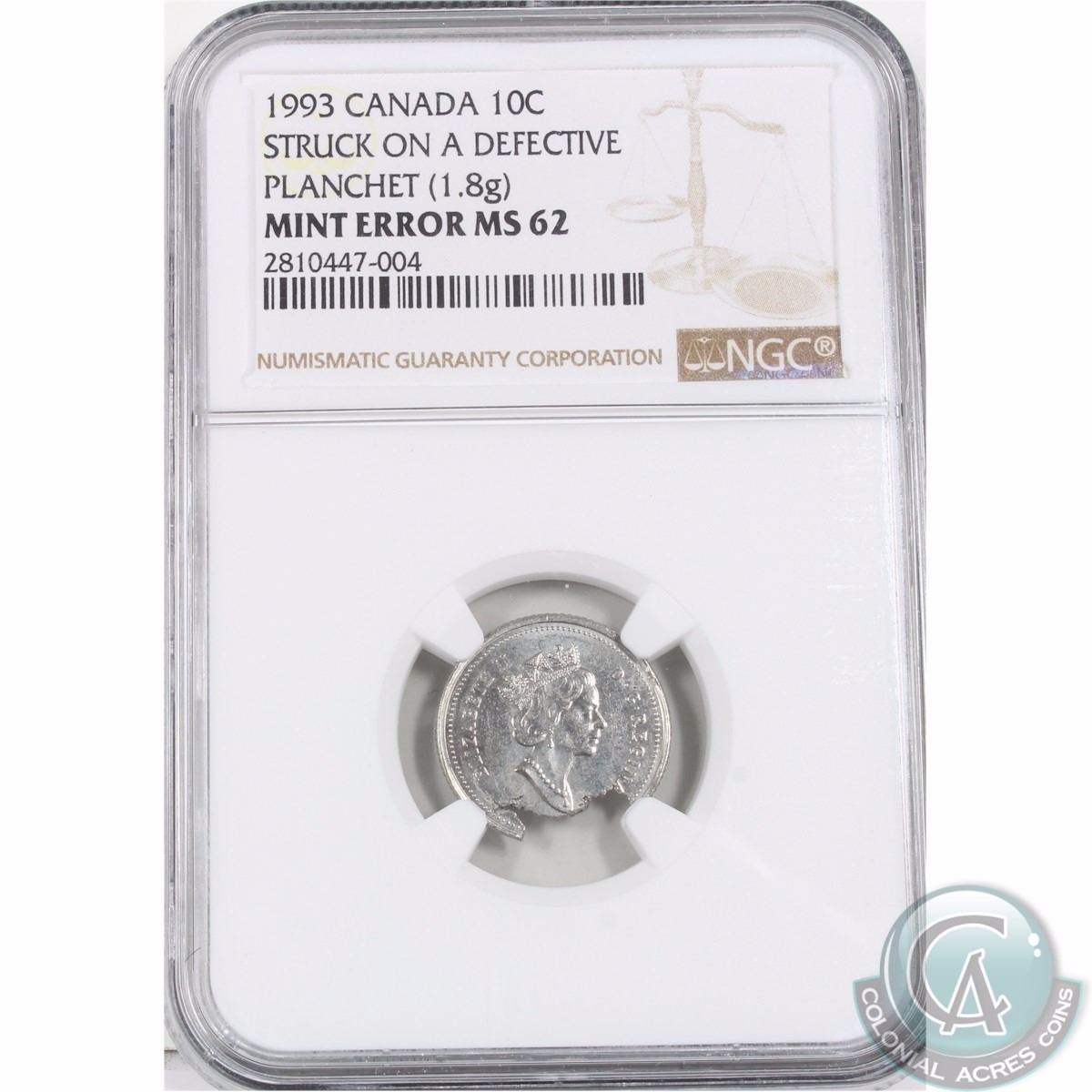 10-cent 1993 Struck on a defective planchet NGC Certified MS-62. This is a stunning error with a lar