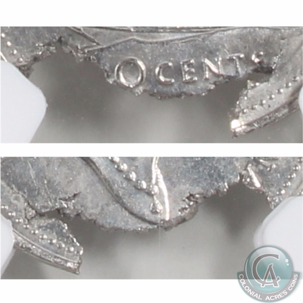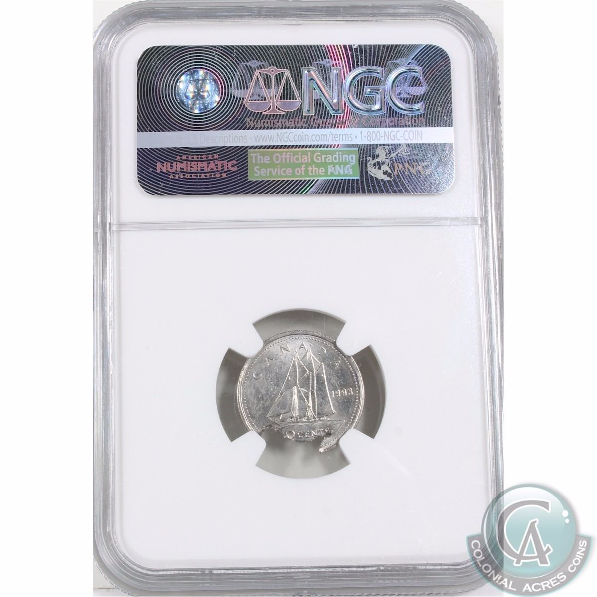 10-cent 1993 Struck on a defective planchet NGC Certified MS-62. This is a stunning error with a large portion of the lower coin missing.