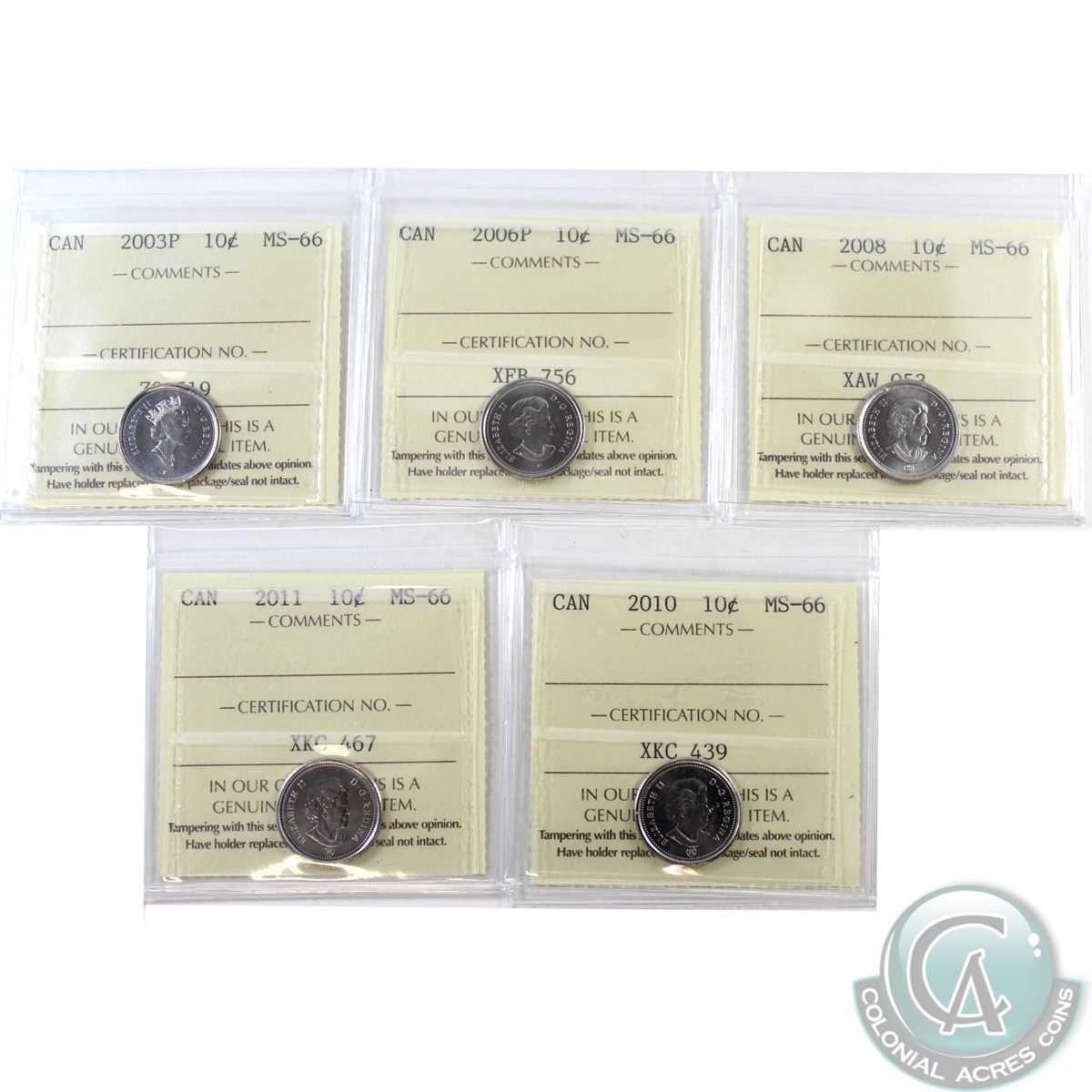 10-cent 2003P, 2006P, 2008, 2010 & 2011 ICCS Certified MS-66. 5pcs