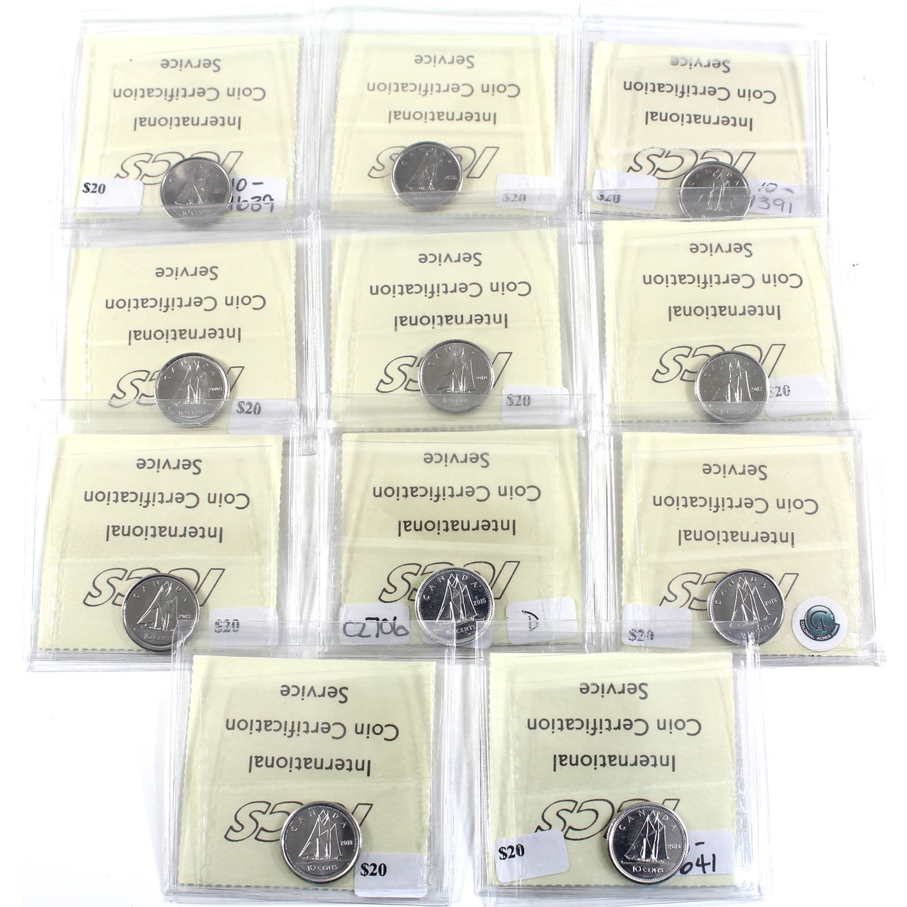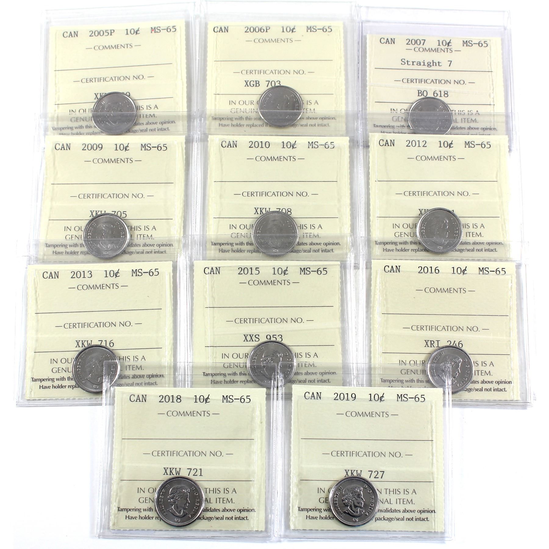 10-cent 2005P, 2006P, 2007 Straight 7, 2009, 2010, 2012, 2013, 2015, 2016, 2018, & 2019 ICCS Certified MS-65. 11pcs.