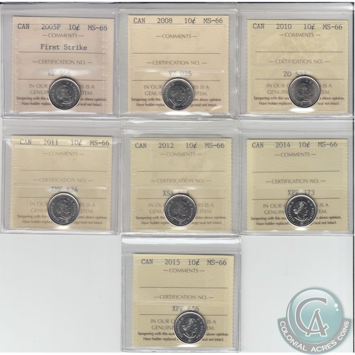 10-cent 2005P, 2008 ,2010,2011,2012,2014 & 2015 All ICCS Certified MS-66. 7pcs