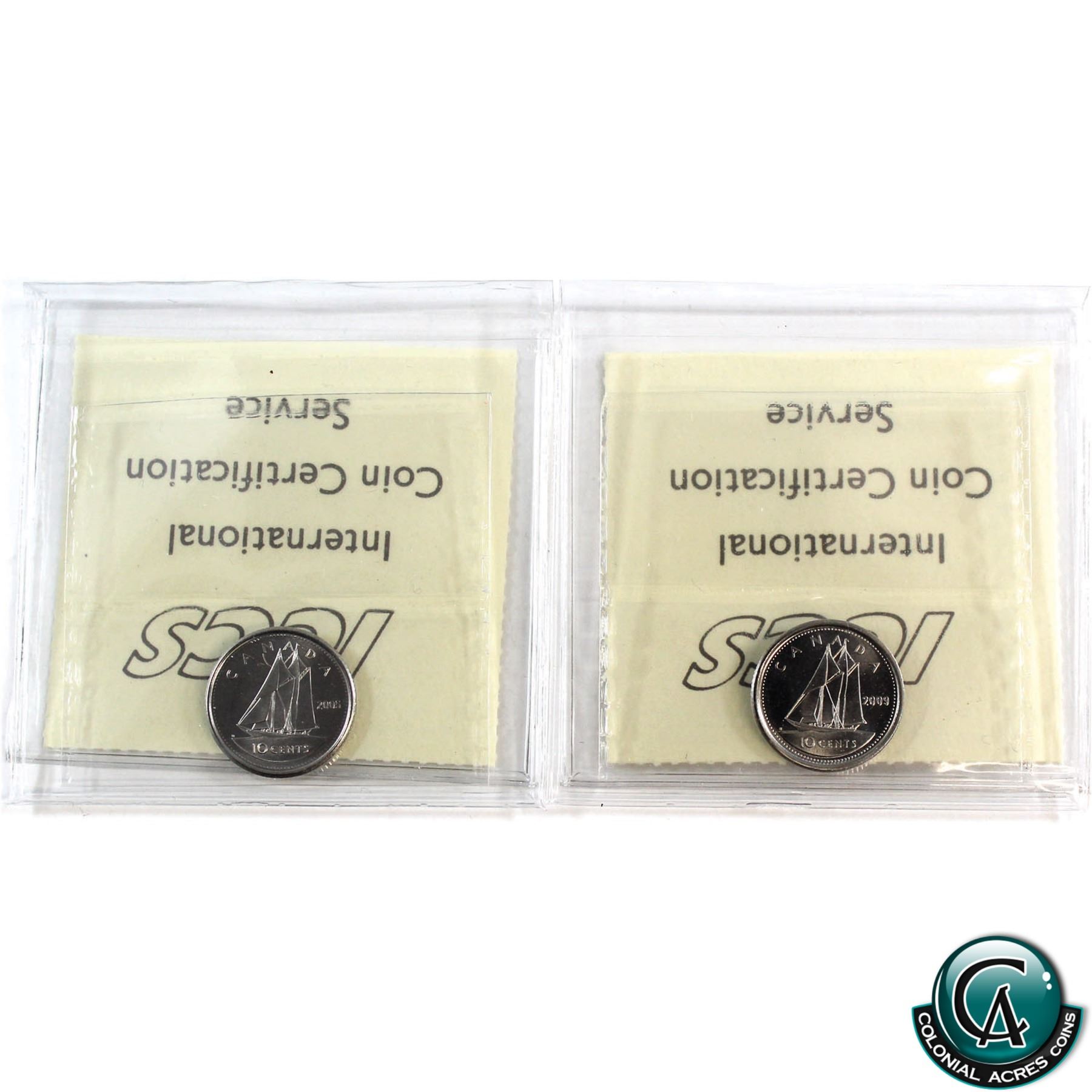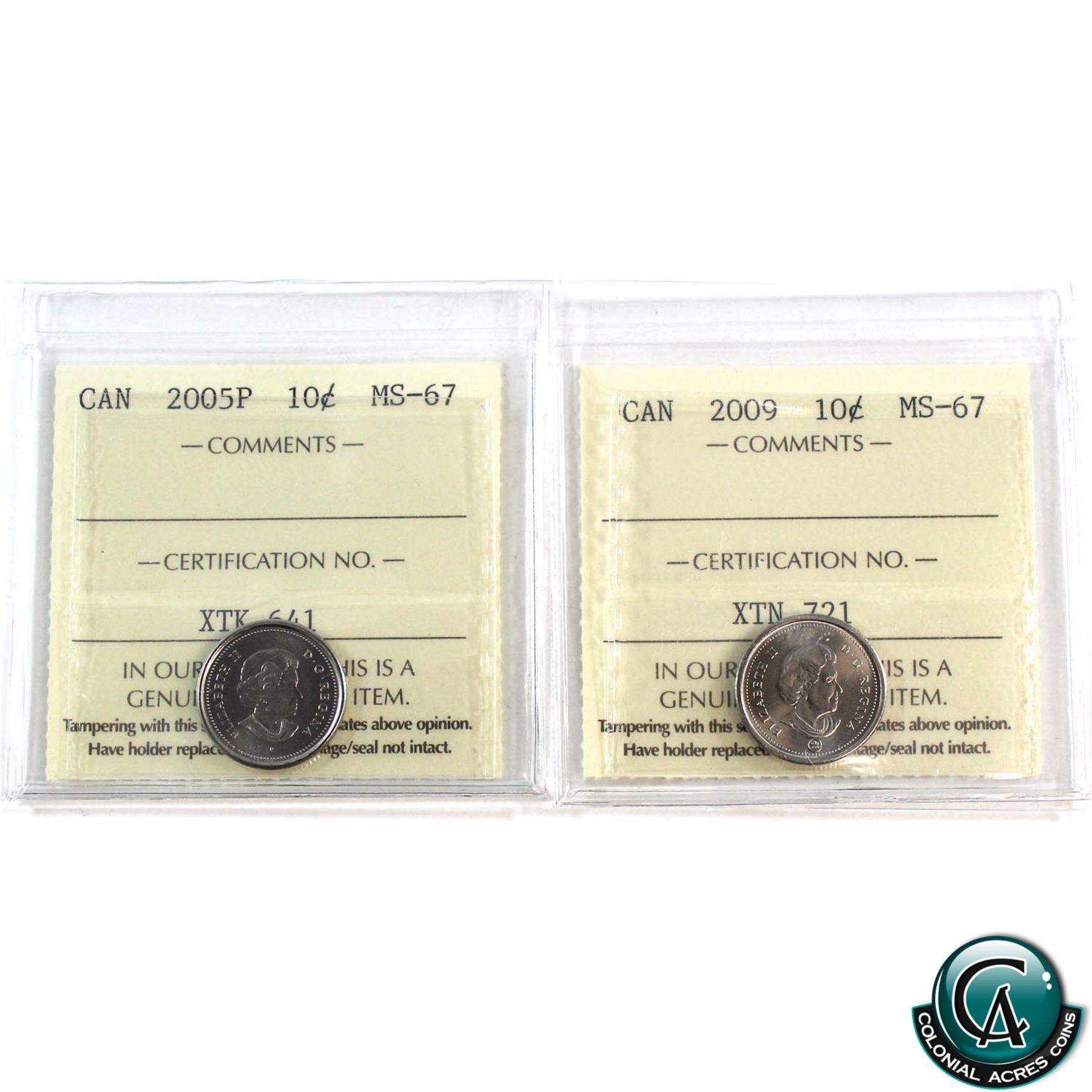 10-cent 2005P & 2009 ICCS Certified MS-67. Both coins tied for finest known. 2pcs.