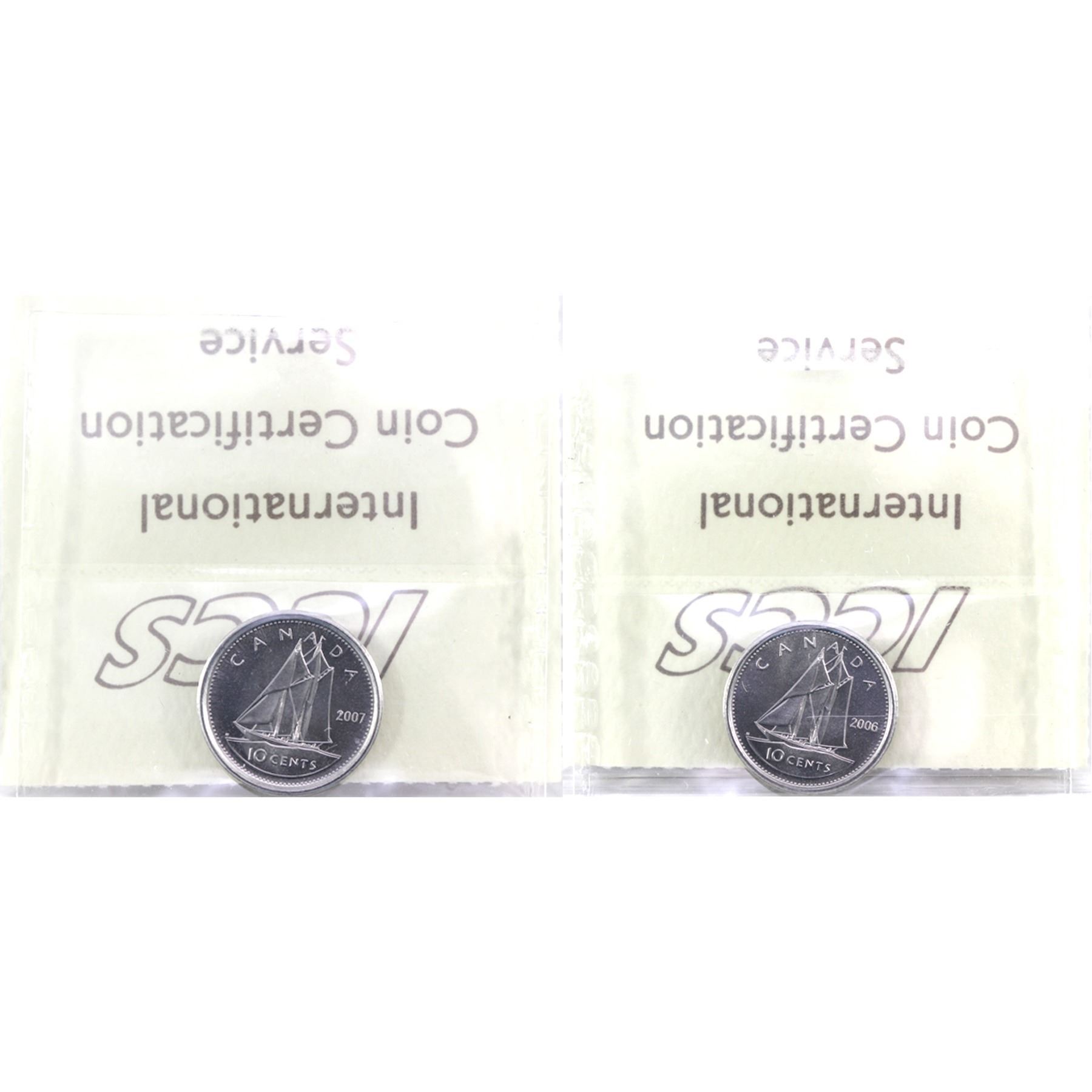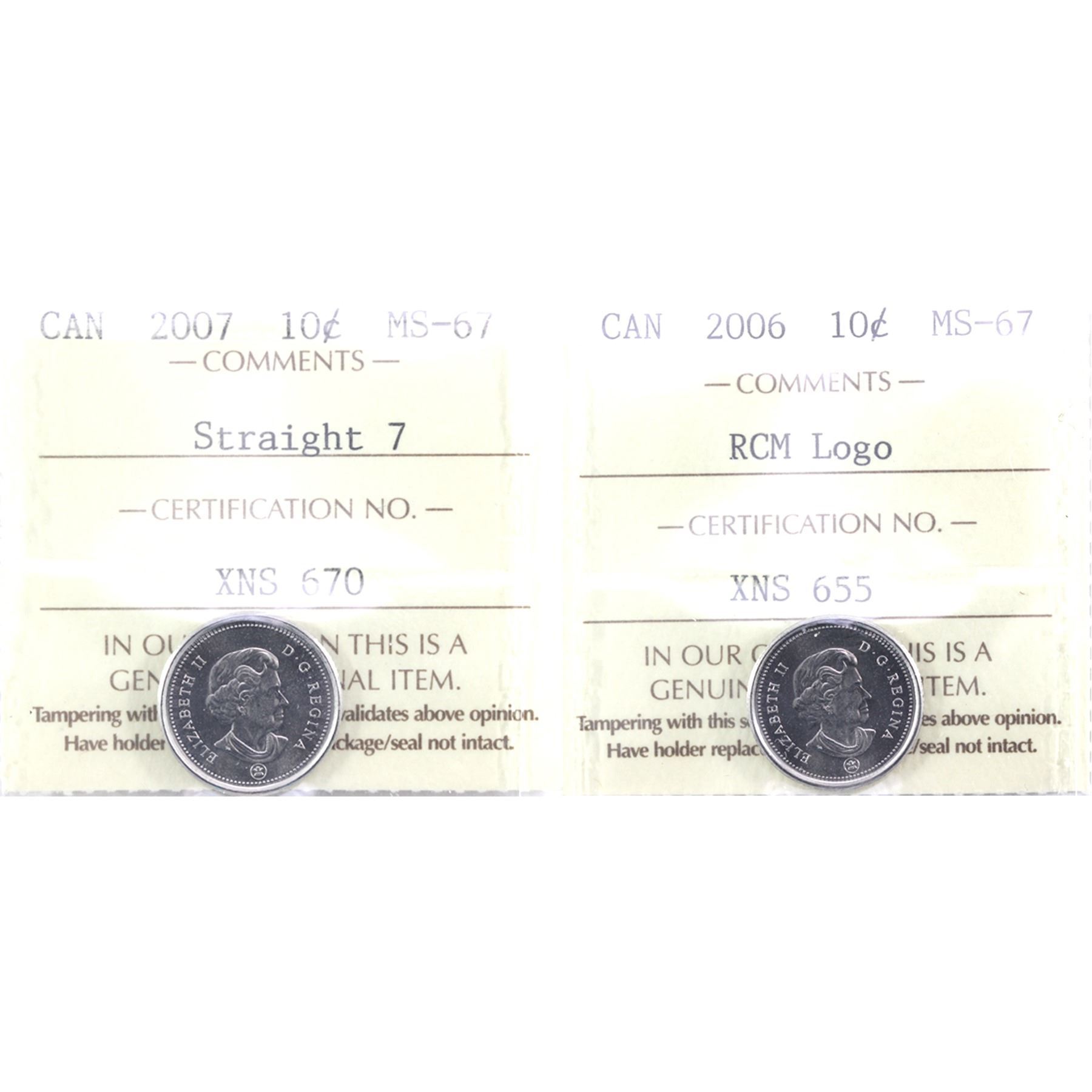 10-cent 2006 RCM Logo & 2007 Straight 7 ICCS Certified MS-67. 2pcs