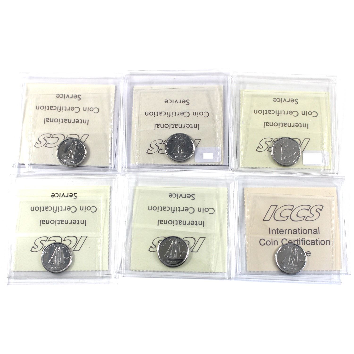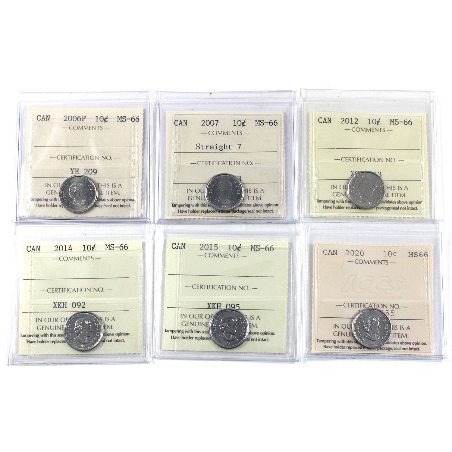 10-cent 2006P, 2007 Straight 7, 2012, 2014, 2015, & 2020 ICCS MS66. 6pcs.