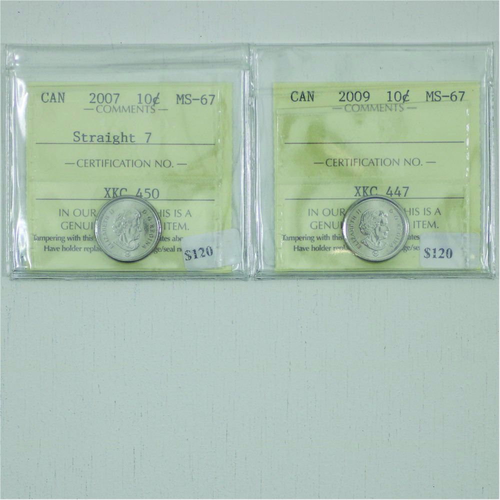 10-cent 2007 Straight 7 & 2009 ICCS MS67. Tied for the finest known. 2pcs