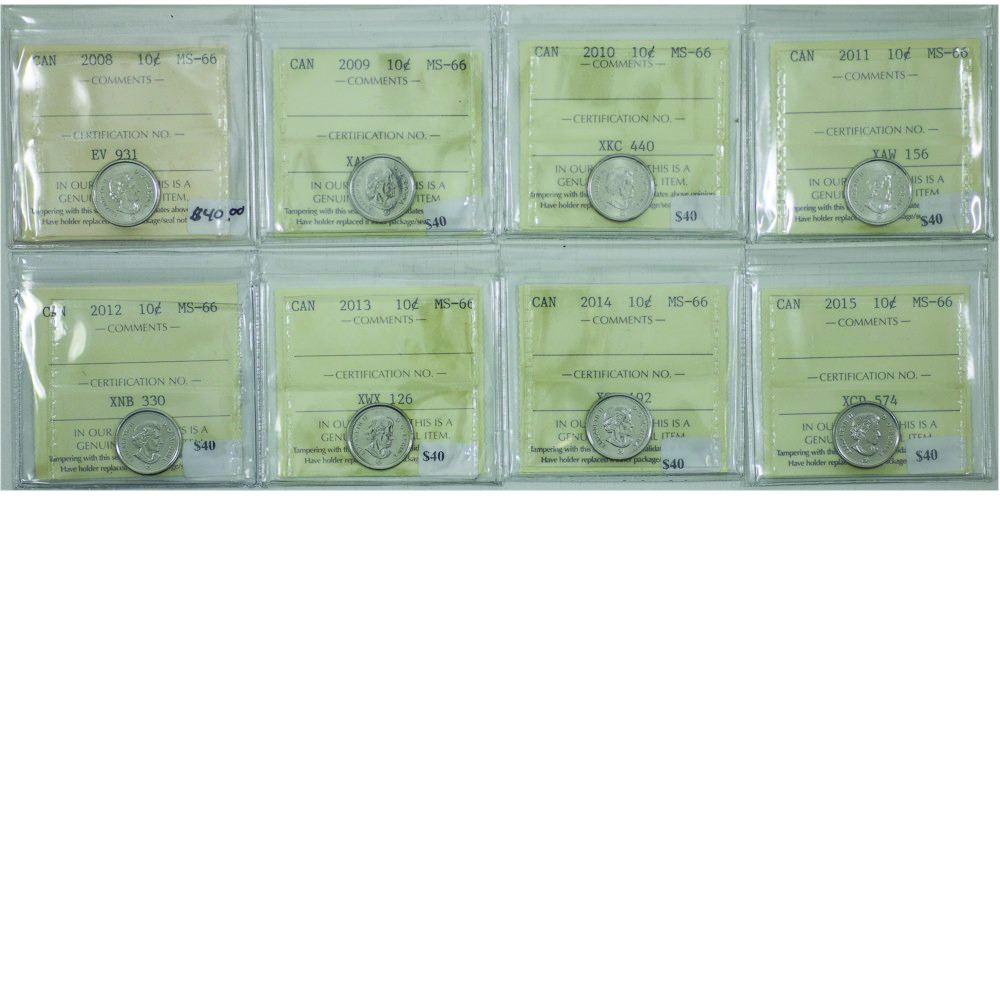 10-cent 2008, 2009, 2010, 2011, 2012, 2013, 2014 & 2015 ICCS MS-66. 8pcs