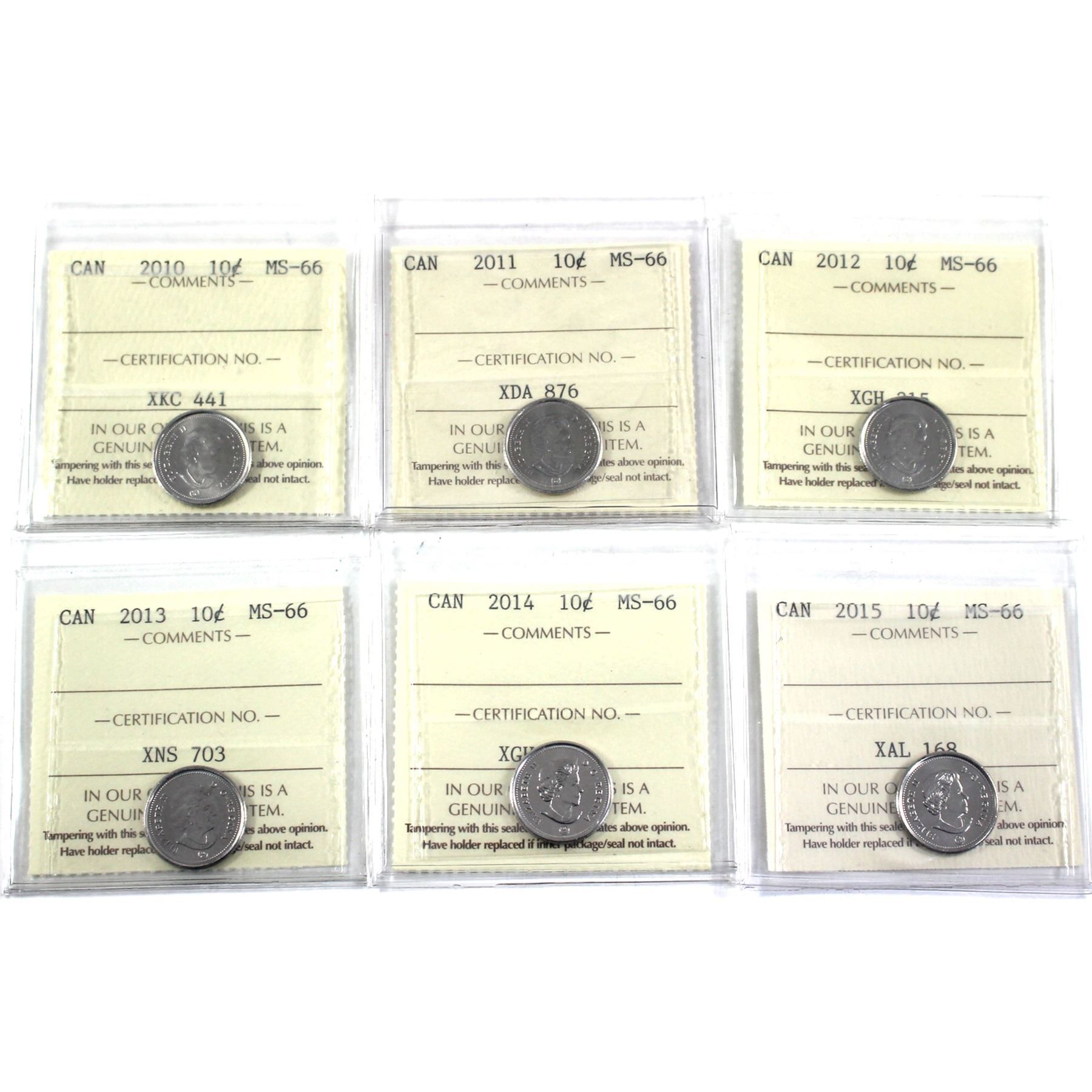 10-cent 2010,2011,2012,2013,2014 & 2015 ICCS Certified MS-66. 6pcs