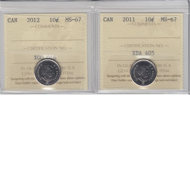 10-cent 2011 & 2012 ICCS MS67. Both tied for the finest known. 2pcs