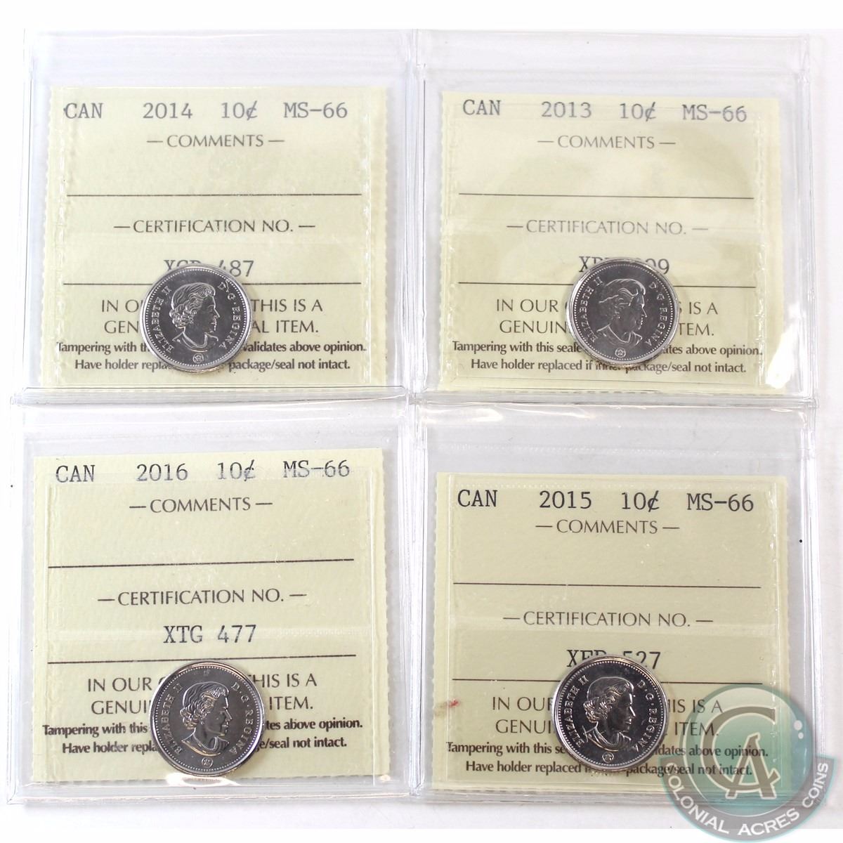 10-cent 2013, 2014, 2015 & 2016 ICCS Certified MS-66. 4pcs