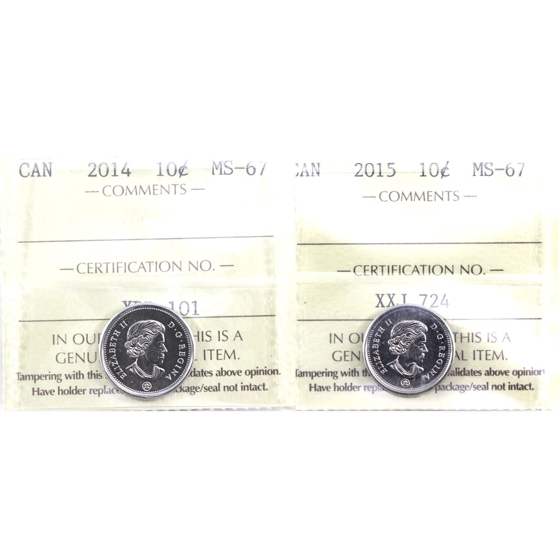 10-cent 2014 & 2015 ICCS Certified MS-67. 2pcs * Top Grade*